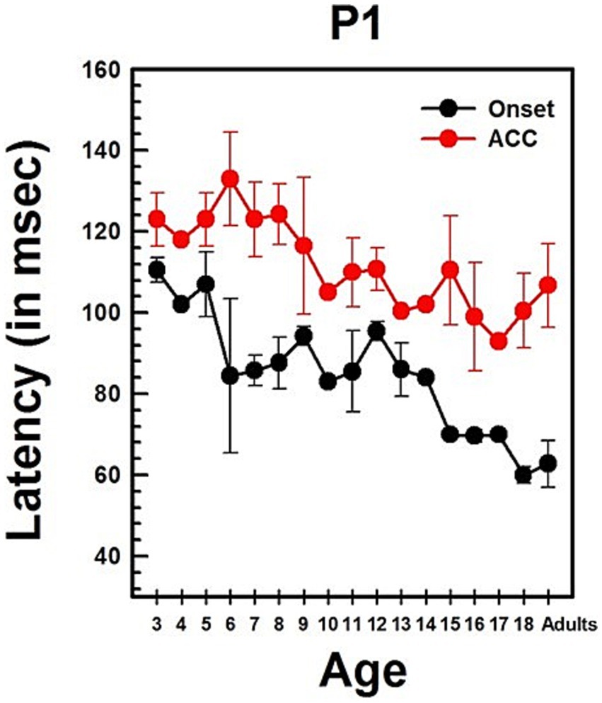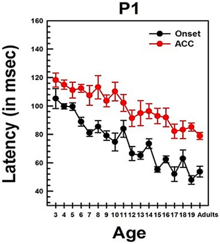 Summary statistics of peak latencies and N1–P2 amplitudes for CAEPs recorded from all NH listeners in quiet conditions are provided in Supplementary Table S2. Traditionally, P1 latency has been used to characterize developmental changes in the onset response since it is observed in all age groups. Figure 4 illustrates the change in P1 latency with age for both the ACC and the onset response. At age 3, P1 latency was measured at 105 ms for the onset response and 118 ms for the ACC. In adults, it was measured at 54 ms for the onset response and 79 ms for the ACC.