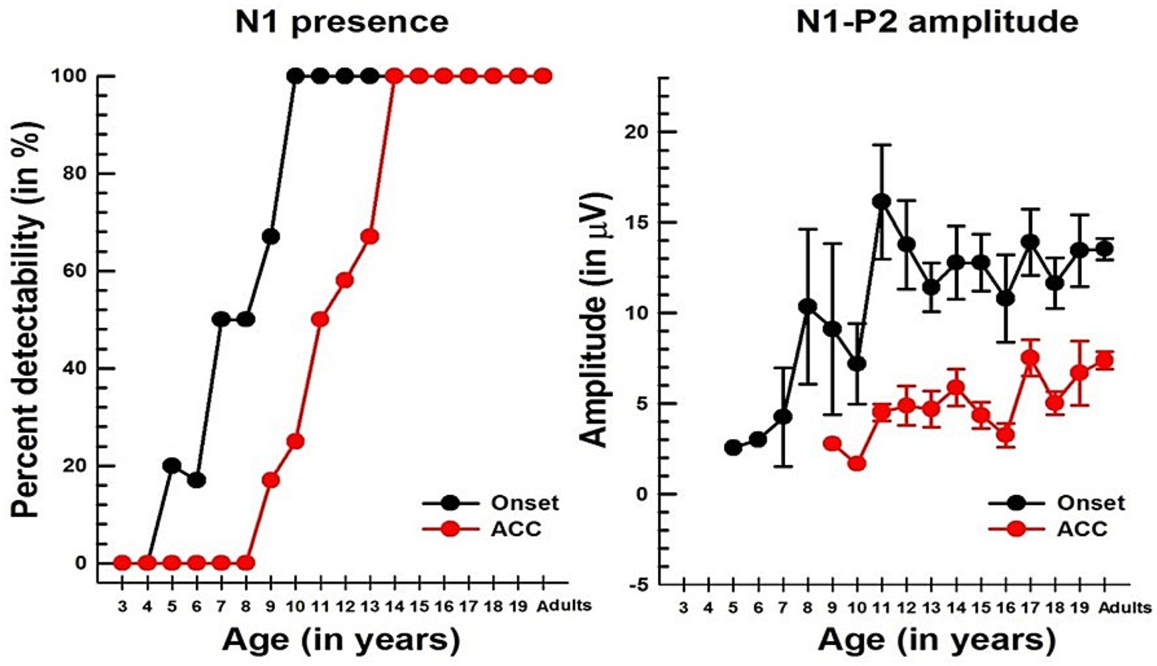Unlike P1, N1 was not observed in young children for either onset or ACC responses, but it emerged in older children. Figure 5 shows the course of development in the detectability of N1 (left panel) and the peak-to-peak amplitude of the N1 and P2 (right panel). For the onset response, N1 was detectable at 5 to 6 years in about 20% of subjects, reached about 50% at 7 to 8 years old, and was present in all subjects over the age of 10. For the ACC, the pattern is similar to that of the onset response; however, it does not emerge until 9–10 years old and is not present in all subjects until 14 years old.