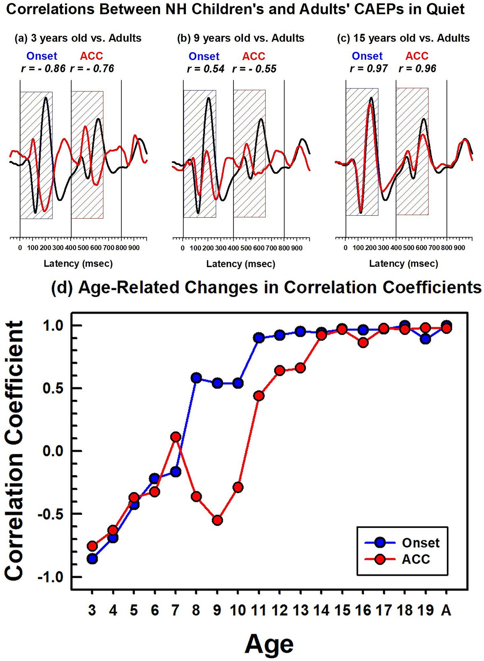 Figure 6. Correlations between NH children's and NH adults' CAEPs in quiet. The top panel figures (a–c) show examples of correlation coefficients between adults’ and children’s grand average waveforms obtained in quiet. The adults’ grand average waveform is shown in black solid lines, and the 3-, 9-, and 15-year-old’s grand average waveforms are in red. The dashed blue and red boxes indicate the duration (250 ms) used for correlation analyses for the onset and the ACC, respectively. The bottom figure (d) shows calculated correlation coefficients for the onset, represented by a blue line with dots, and the ACC, represented by a red line with dots. For the adults’ noise level, the adult group was divided into two groups, and a correlation coefficient was calculated between the two adult groups.