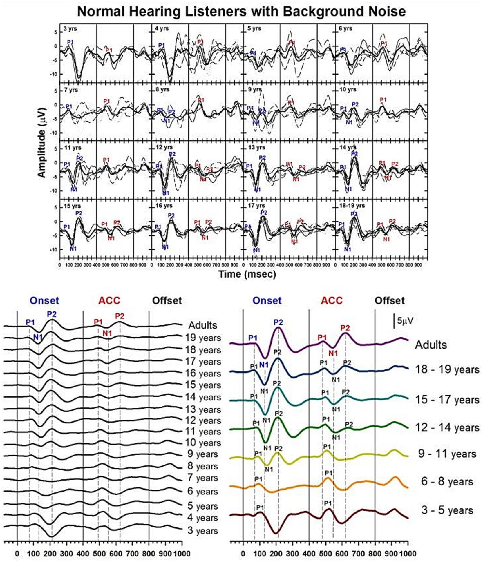 For ACC responses, P1 is the only evident component from 3 to 8 years of age. The N1 of the ACC appears as early as 10 years old in the grand average waveform (left panel). N1-P2 peaks are evident at 9 to 11 years, and their amplitude grows with age. The morphology of the ACC becomes adult-like at 15 to 17 years, with the P2 amplitude becoming larger than P1.