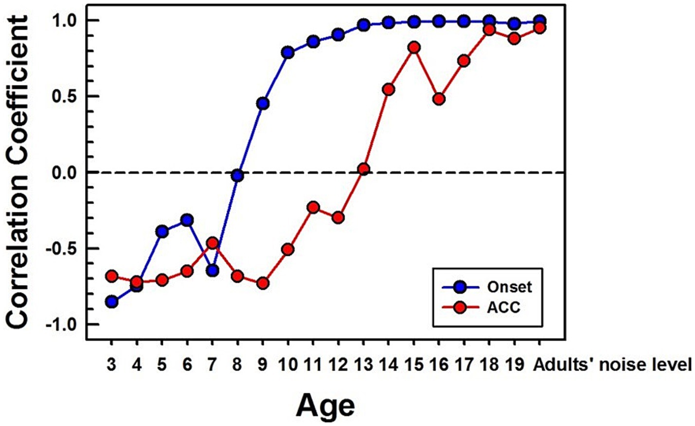 Figure 8. Correlations between NH children's and NH adults' CAEPs in noise. Correlation coefficients are calculated between each age group’s grand average waveform obtained with background noise and the adult’s in noise. The blue line with dots represents the onset response, and the red line with dots represents the ACC. The same time window (250 ms) after a stimulus onset and change was used for correlation calculation for onset and ACC responses, respectively. For the adults’ noise level, the adult group was divided into two groups, and a correlation coefficient was calculated between the two adult groups.