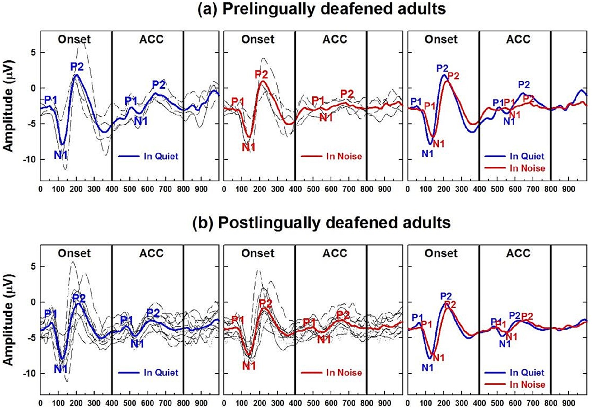 Figure 9. Adult CI users’ CAEPs in quiet and noise conditions. (a) Plots cortical auditory evoked potentials obtained from pre-lingually deafened CI adults and (b) from post-lingually deafened adults. The left and center panels show responses measured in quiet and noise listening conditions, respectively. Individual data are shown in black, and grand average waveforms are shown in blue and red for each listening condition. The right panel compares grand average waveforms between the two listening conditions for each of the CI groups.