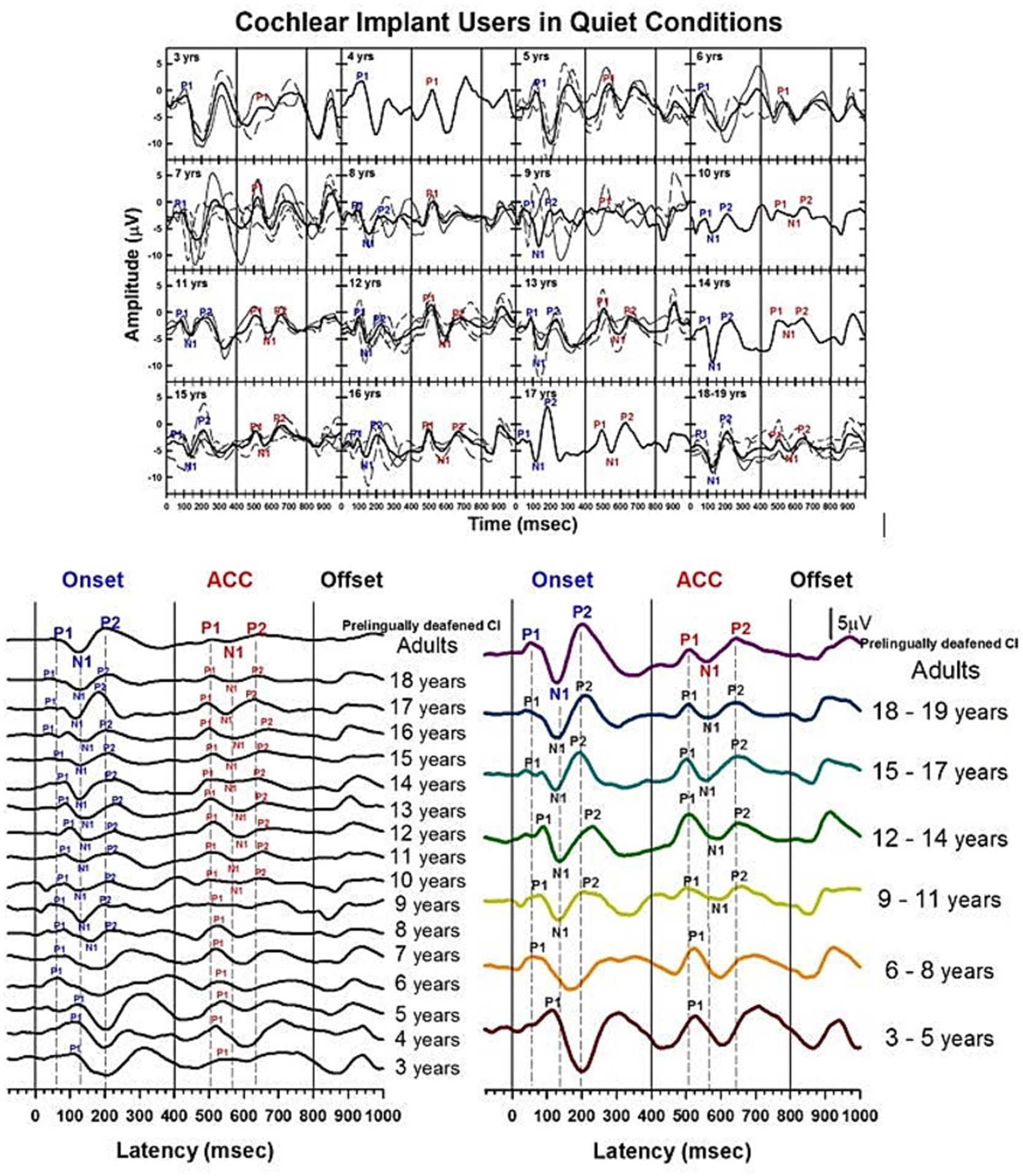 Figure 10. Waveforms of CAEPs in pre-lingually deafened CI users in quiet. Grand average waveforms measured at the electrode Cz are shown for early-implanted, pre-lingually deafened CI listeners. The top panel shows individual waveforms and grand average waveforms for each age group. The bottom left panel shows grand average waveforms for each age group ranging from 3 to 18 years, and adults. The bottom right panel shows grand average waveforms for five groups of children, grouped in three-year intervals, and adults. The three straight lines at 0, 400, and 800 ms indicate the onset, change, and offset of the stimulus, respectively. Dashed lines indicate when P1, N1, and P2 components are shown in adults’ onset and ACC responses.