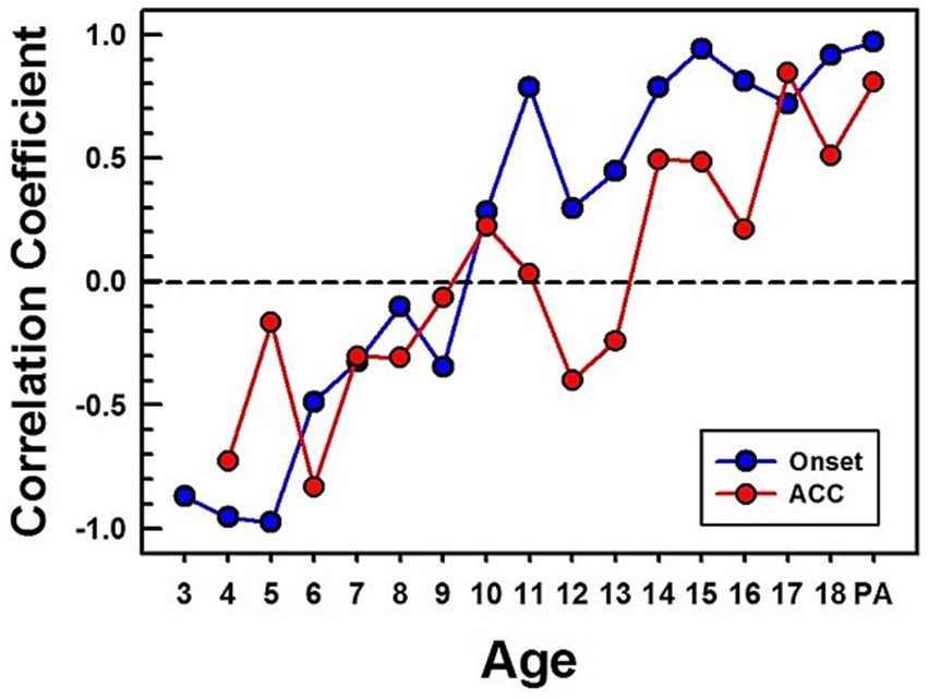 Figure 12 shows calculated correlation coefficients between grand average waveforms of the early-implanted CI children and NH adults. The same method used for calculating correlation coefficients for NH (shown in Figure 6) was applied to CI children. All calculated correlation coefficients for the onset are shown in blue dots, and for ACC, in red dots.