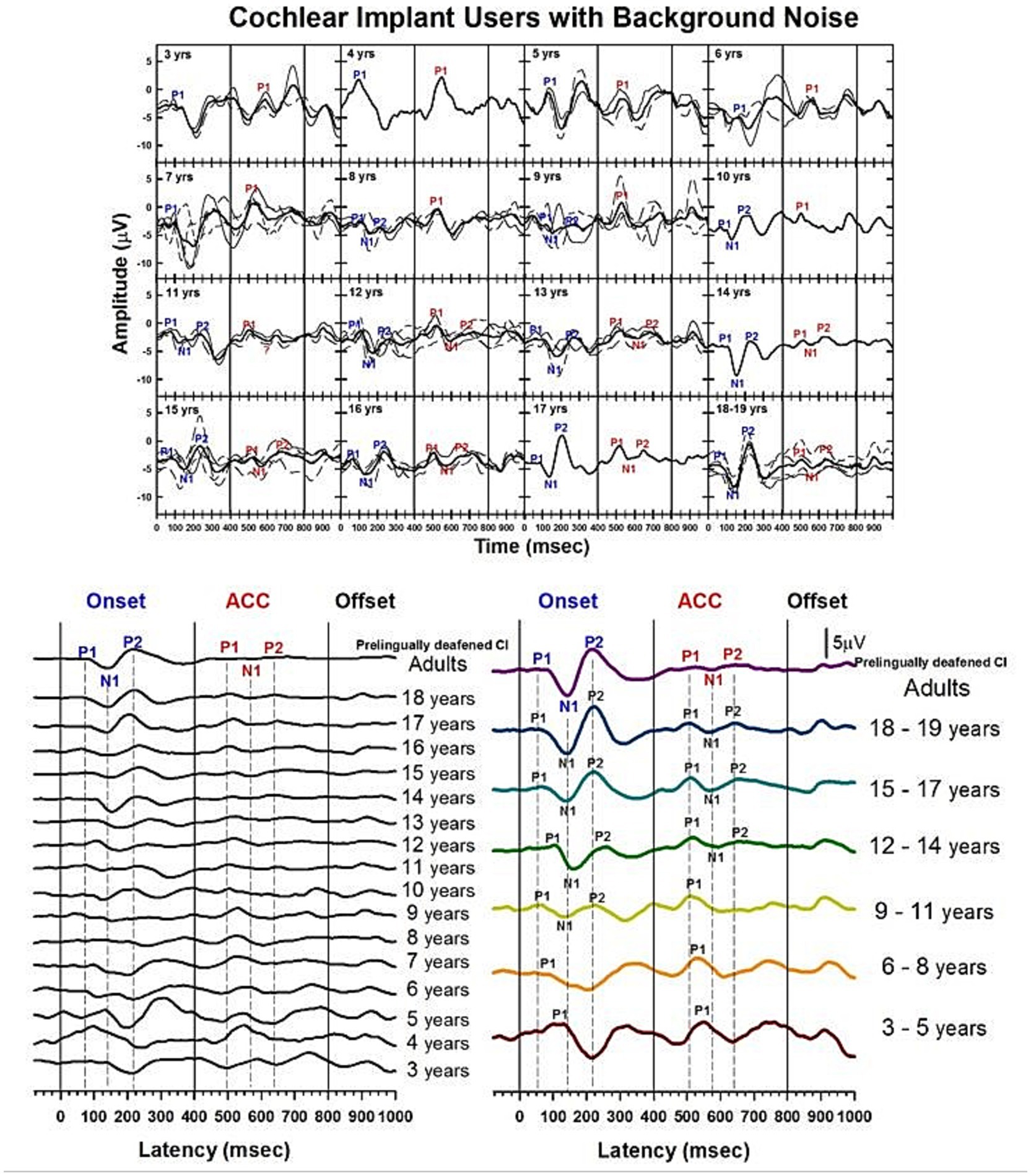 Previous sections have shown results of NH listeners in quiet and with background noise. The following sections will focus on how the onset P1-N1-P2 and the ACC change with age in individuals who were born deaf but received a CI early in life.