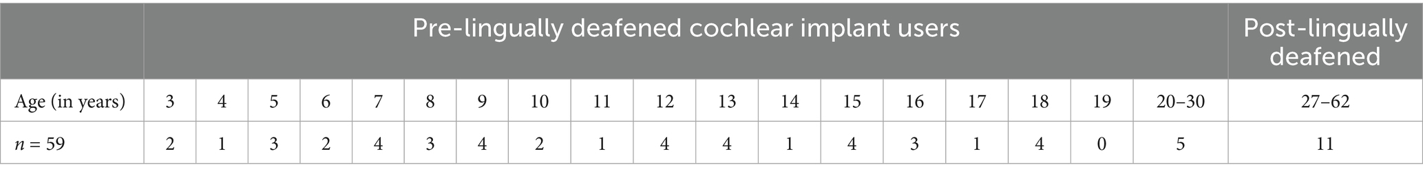 For CI users, a total of fifty-nine subjects participated. Forty-three pre-lingually deafened CI children and adolescents between the ages of 3 and 18, and five pre-lingually deafened CI adults between the ages of 20 and 30 participated (mean = 25, SD = 3). Additionally, eleven post-lingually deafened CI adults between the ages of 27 and 63 (mean = 50, SD = 14) participated in this study. All CI users were recruited from the University of Iowa Hospitals and Clinics (UIHC) research subject database. All pre-lingually deafened CI children received their CI(s) before 3.5 years of age with the Cochlear CI system. All post-lingually deafened adult participants had acquired hearing loss after the age of 20, i.e., after they developed typical speech and language skills.