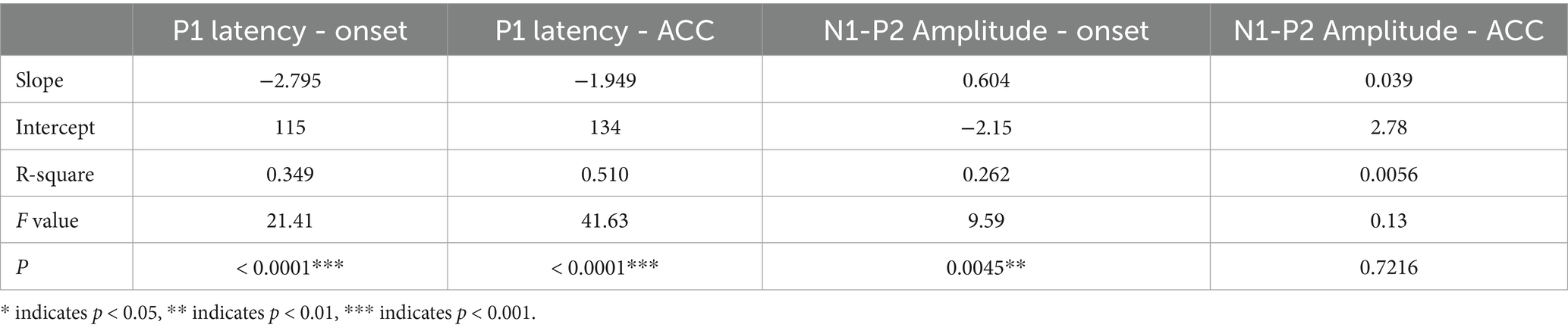 Table 3 presents the results of linear regression analyses examining the relationship between age and both P1 latency and N1–P2 peak-to-peak amplitude for onset and ACC responses in quiet conditions. These analyses were conducted using data from pre-lingually deafened CI users. The findings reveal significant age-related changes, particularly in the ACC responses, indicating ongoing cortical maturation in this population. Table 3. Linear Regression of age on P1 latency and N1–P2 amplitude in quiet for pre-lingually deafened CI users.