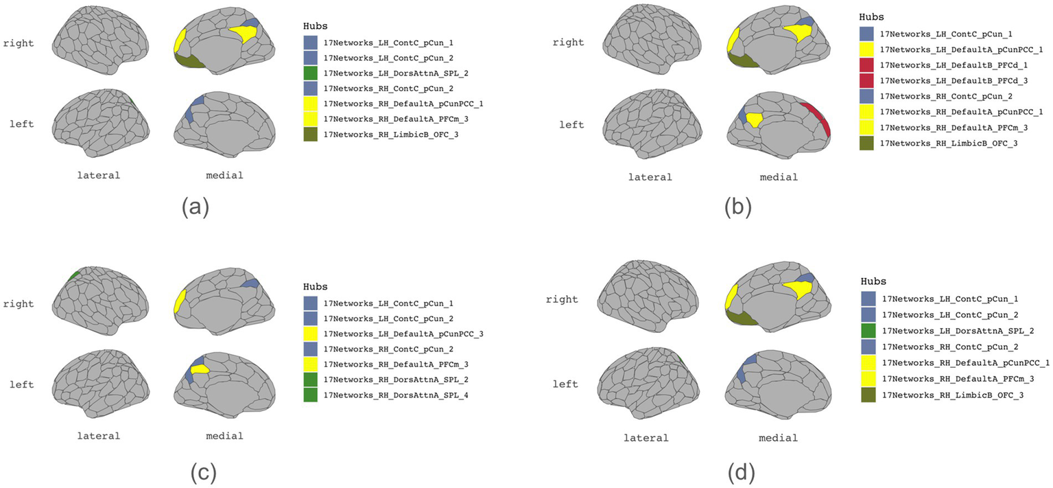 In addition to hub regions shared by all four subdomains of executive functions, our findings also identified unique hubs for cognitive inhibition as the left posterior cingulate cortex/precuneus and the left dorsal prefrontal cortex. Moreover, the mental shifting function relied on hub regions such as the left posterior cingulate cortex/precuneus and the right superior parietal lobule. The superior parietal lobule had previously been studied for the function of attentional shifting (Wang et al., 2014). Interestingly, bilateral inferior parietal lobules exhibited high connectivity in cognitive inhibition, aligning with the previous study on the parietal cortex’s contribution to inhibitory processes (Kolodny et al., 2017). Potential treatment strategies could be developed by targeting these regions for executive function disorders such as ADHD and inhibitory control disorders.