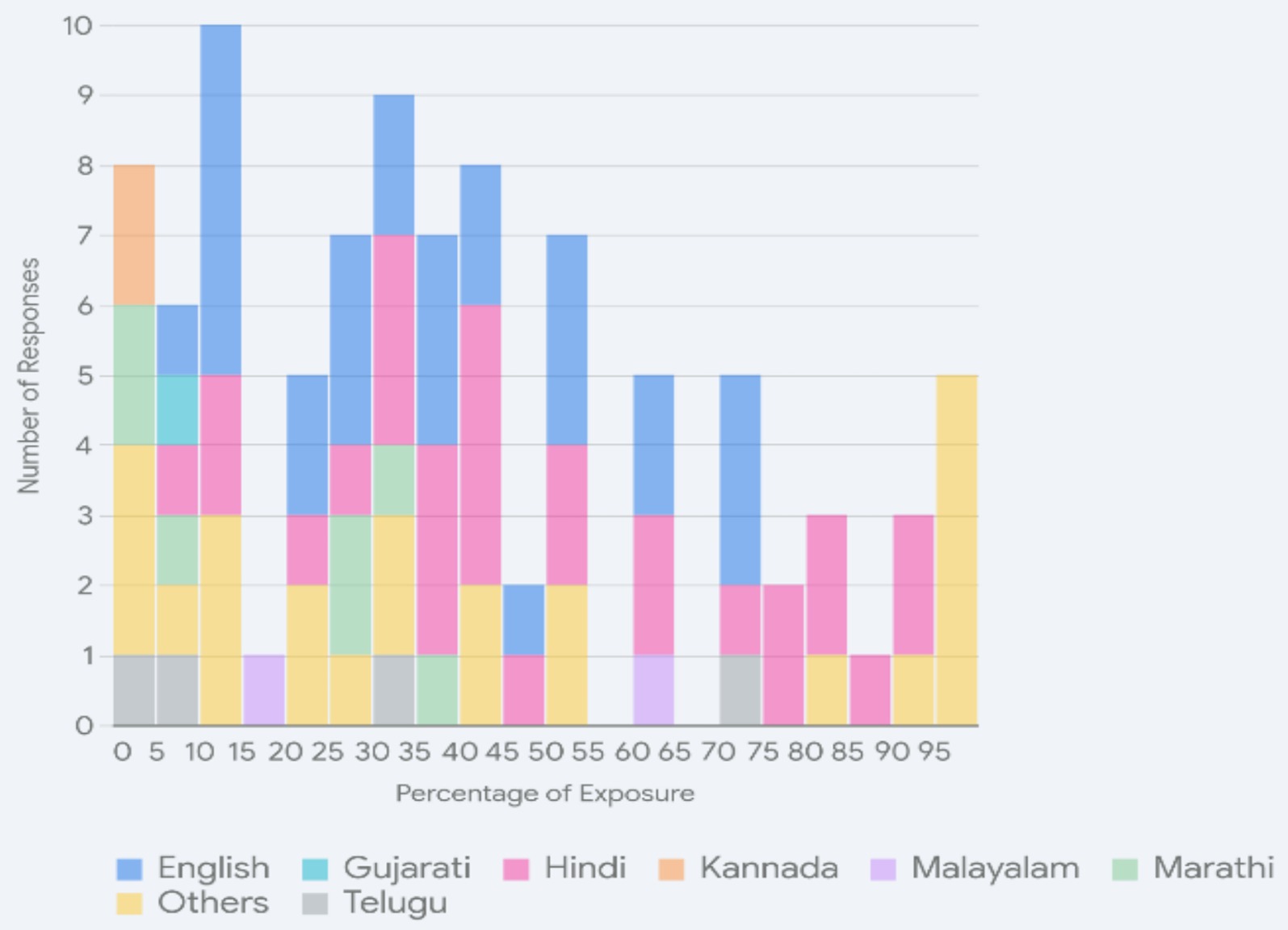 The responses to the question asking about current (continued26) exposure to the languages showed similar patterns to the overall dominance. In Figure 2, the overlaid histogram provides a summary overview showing the distribution of language exposure percentages for English, Hindi, Marathi, Tamil, Telugu, Malayalam, Gujarati, Kannada, Sindhi, Rajasthani, and Marwari. The remaining languages have been assigned much lower percentages and are grouped under “Others.” The percentages represent the quantum of exposure across languages (colour-coded). For example, English receives exposure across the responses between 5 and 75%, Hindi between 5 and 90%, and so on. The histogram shows how widespread the two national languages are across individuals in contrast to the limited space claimed by the regional languages.