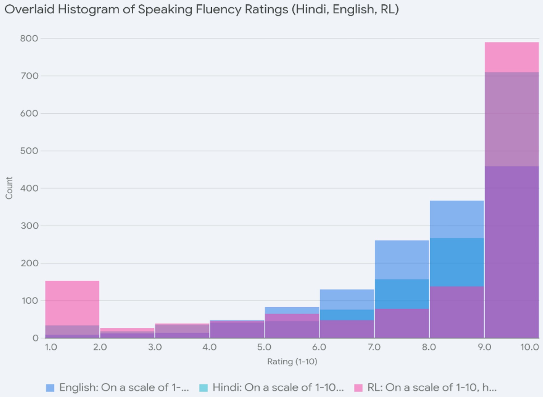 We also asked the students to rate themselves on a scale of 1–10 for fluency in speaking and fluency in reading instructions or forms in Hindi, English, and the regional languages, and we found interesting patterns. We grouped all the regional languages together, given that only a very few of them were numerically dominant and all function along similar lines for fluency ratings.