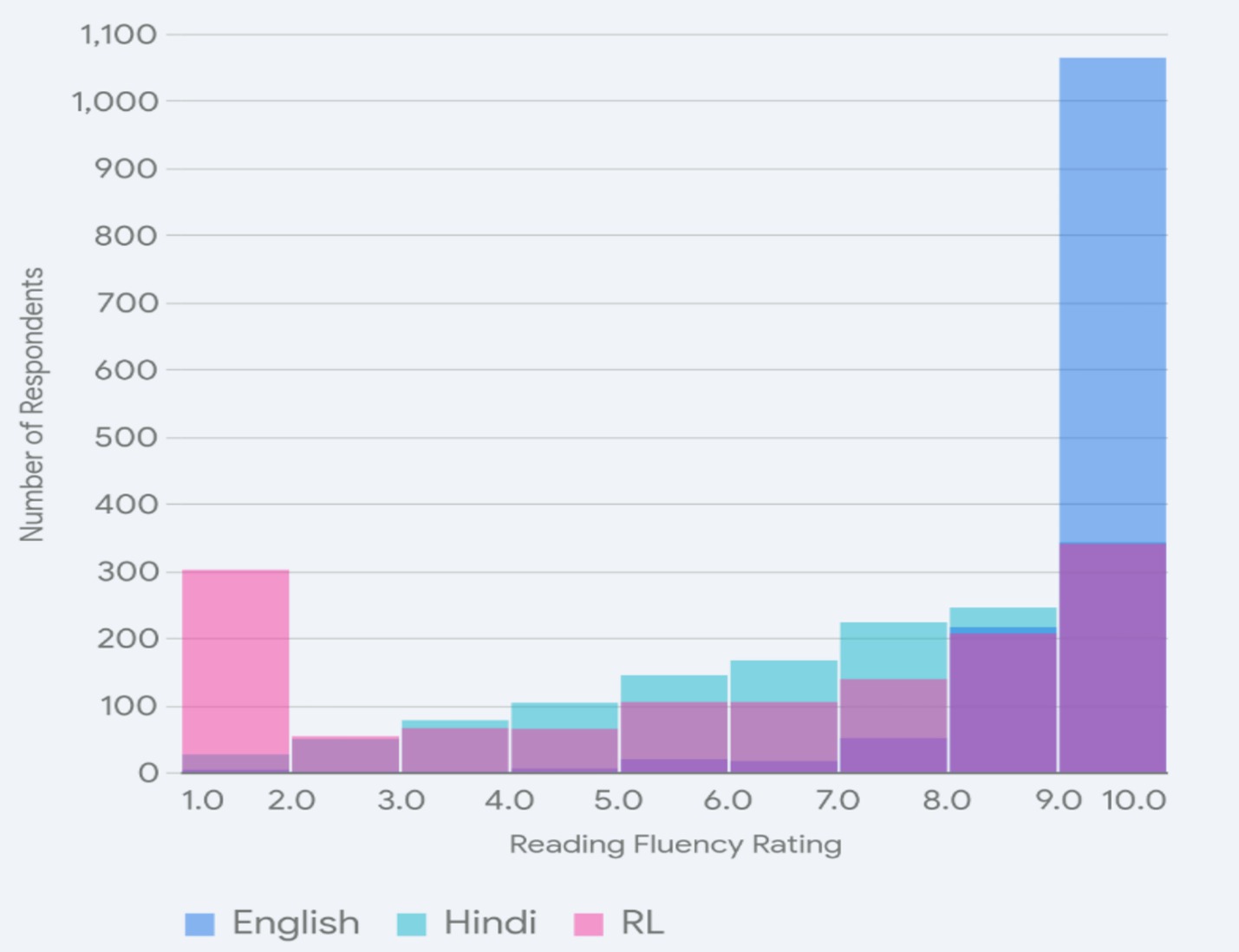 We begin by presenting the large-scale patterns in the responses and then move to the finer details of the linguistic experiences that we have gathered from the survey. Unlike the national census, where only a third of the population was bilingual or trilingual and the rest primarily monolingual, we found that about 23% of the participants were bilingual (Hindi and English), while the rest, a dominant 77%, were trilingual (with Hindi, English, and a regional language as the L1). This was expected because most students have gone through an education system for ten to twelve years with the TLF.