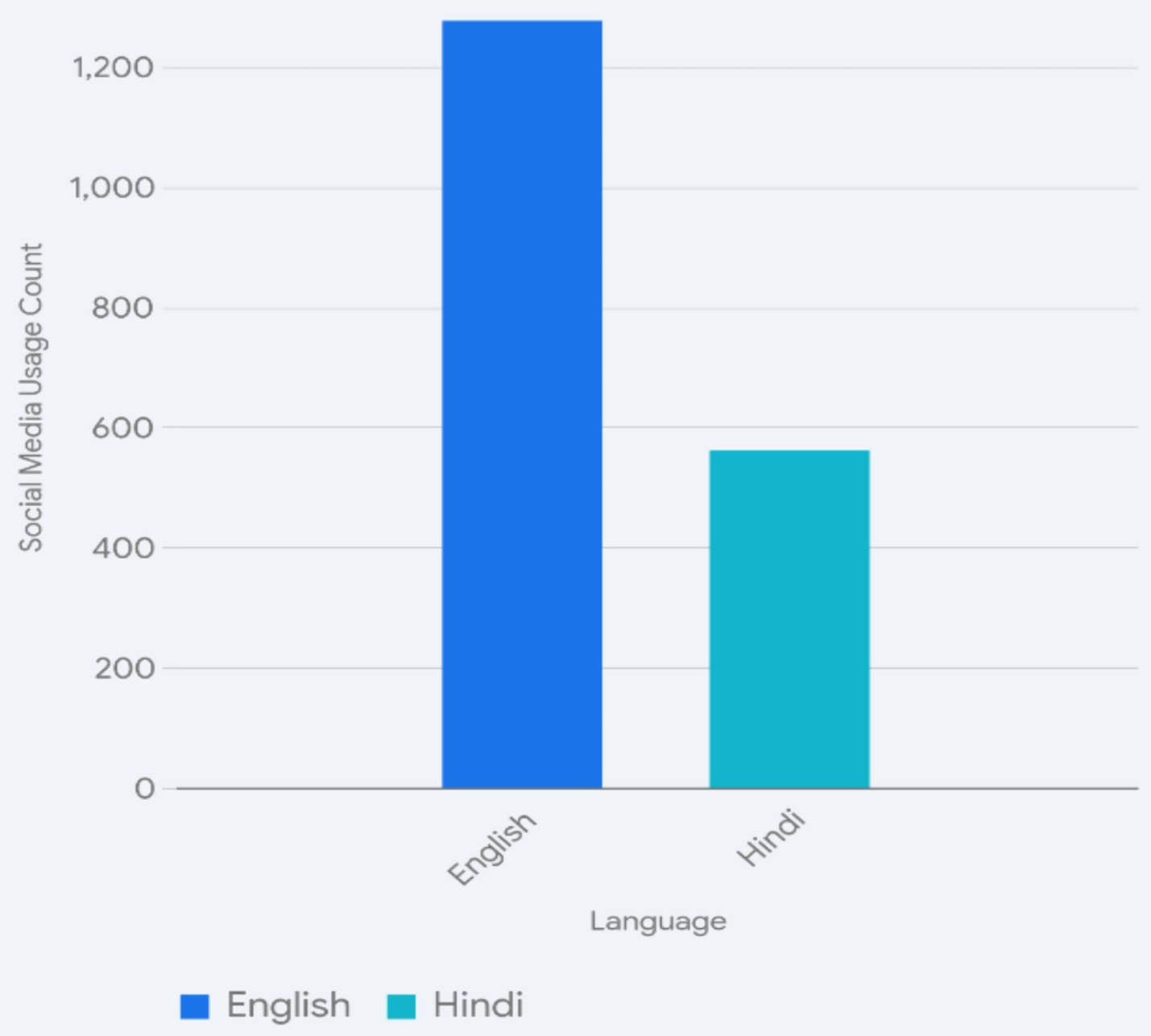 Hindi was primarily used for interpersonal communication, entertainment, and daily life. Students chose interacting with friends and younger family members (1,218 responses), watching TV programmes and movies, or listening to music and the news (1,109 responses each), and shopping or dealing with vendors and the larger society (1,061 responses) as the main contexts for the use of Hindi. In contrast, English was predominantly used for formal and casual reading (1,285 responses) and for activities online (such as engagement with social media, 1,276 responses), but also for casual reading, watching TV/movies, listening to music, and interacting with friends. The regional language was used to interact with family members, with an emphasis on older family members and grandparents (1,135 responses), interacting with friends, shopping, interacting with vendors and the larger society, watching TV/movies, listening to music, and using social media, but dramatically less so than in English. The responses suggest that the regional language is used for interactions with family and friends, social connections, and daily life within a local community. It is important to note that the students said they interacted with their older relatives in Hindi (53.12%) or in a regional language (46.88%) but never in English. This shows an intergenerational divide in language use, which may destine the regional languages to become HLs. However, it also tells us that English has not fully entered this domain of communication, though in urban areas we do find that this shift is increasingly visible, especially where the parents are “westernized” and already comfortable in English. In Figure 7, we can see that English outstrips Hindi as the popular language for social media and online presence.