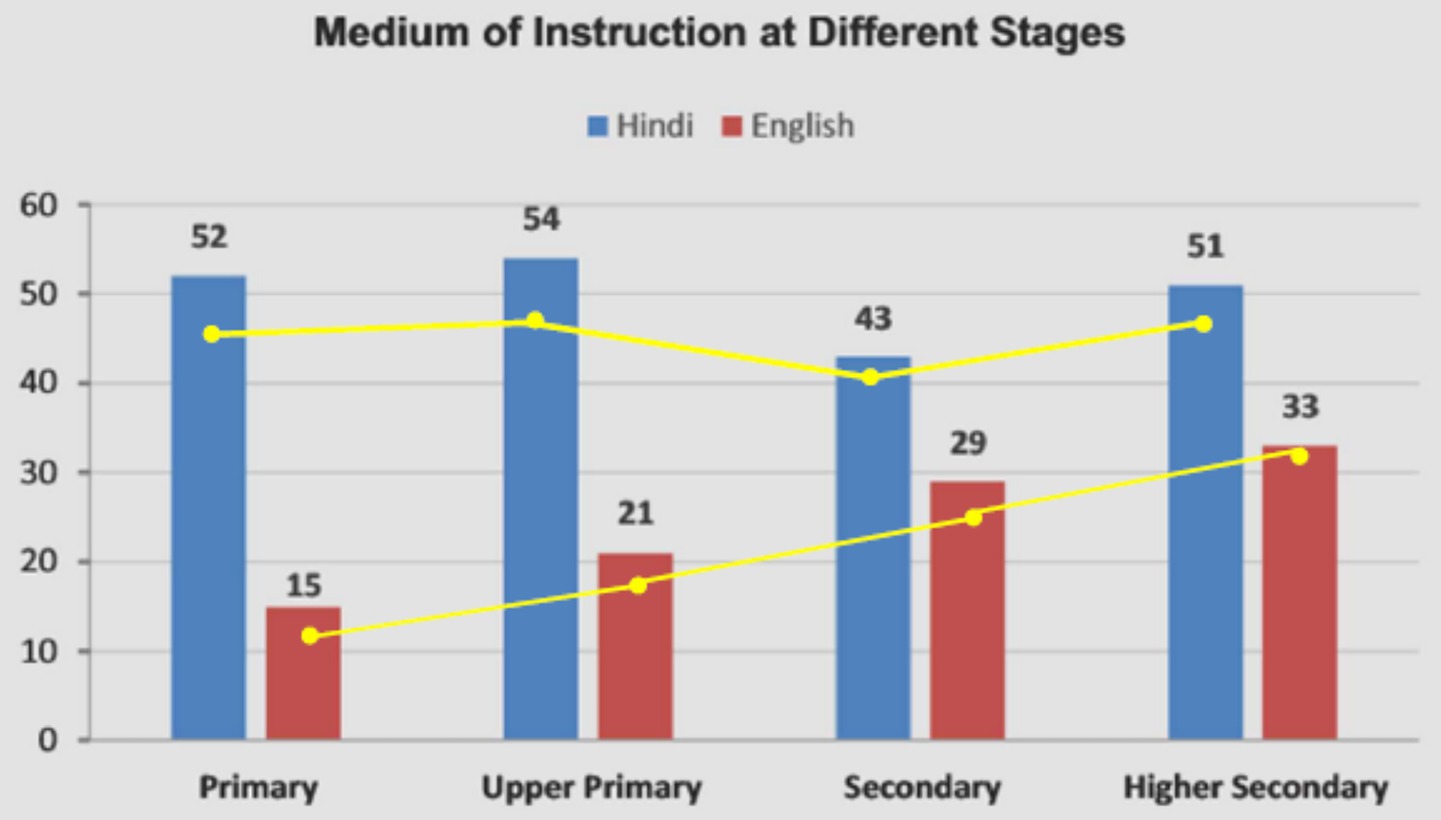 Data in the AISES reports also capture similar patterns (Figure 8). The yellow line indicates the patterns from the 7th AISES (NCERT, 2009), showing overall growth for both languages. The report displays the change in MoI at various stages. Hindi is generally stable through the school years (the dip in the secondary years is not explained), but English shows steady growth over the school years. The same patterns of change are visible in both reports, except that the gross number of schools has increased over the years.