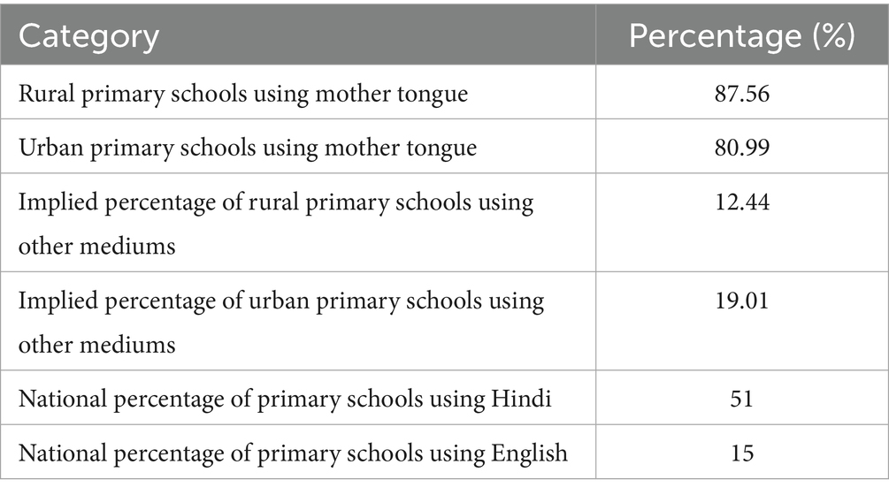 The most recent Eighth All India School Education Survey (8th AISES, 2009) finds the following patterns with respect to MoIs (see Table 1). The number of schools having primary (6–8 years of age), upper primary (9–12 years of age), secondary (13–15 years of age), and higher secondary (16–17 years of age) stages in education increased by 20, 40, 33, and 42 percent, respectively, since the 7th AISES in 2002. With respect to MoI, it finds that 86.62% of schools at the primary stage teach through L1 (a decrease of 5% since 2002). A comparison of rural and urban schools showed that MoI is the same as the mother tongue (MT) in 87.56% of schools in rural areas and 80.99% of schools in urban areas, compared to 90.39 and 92.39% of schools, respectively, in the 7th AISES. This shows an overall dominance of the MT in both spaces, but with a sharp decline in the use of regional languages, particularly in urban locations. In addition, the survey also shows that Hindi is quite dominant in use in the primary years compared to English as the MoI.16