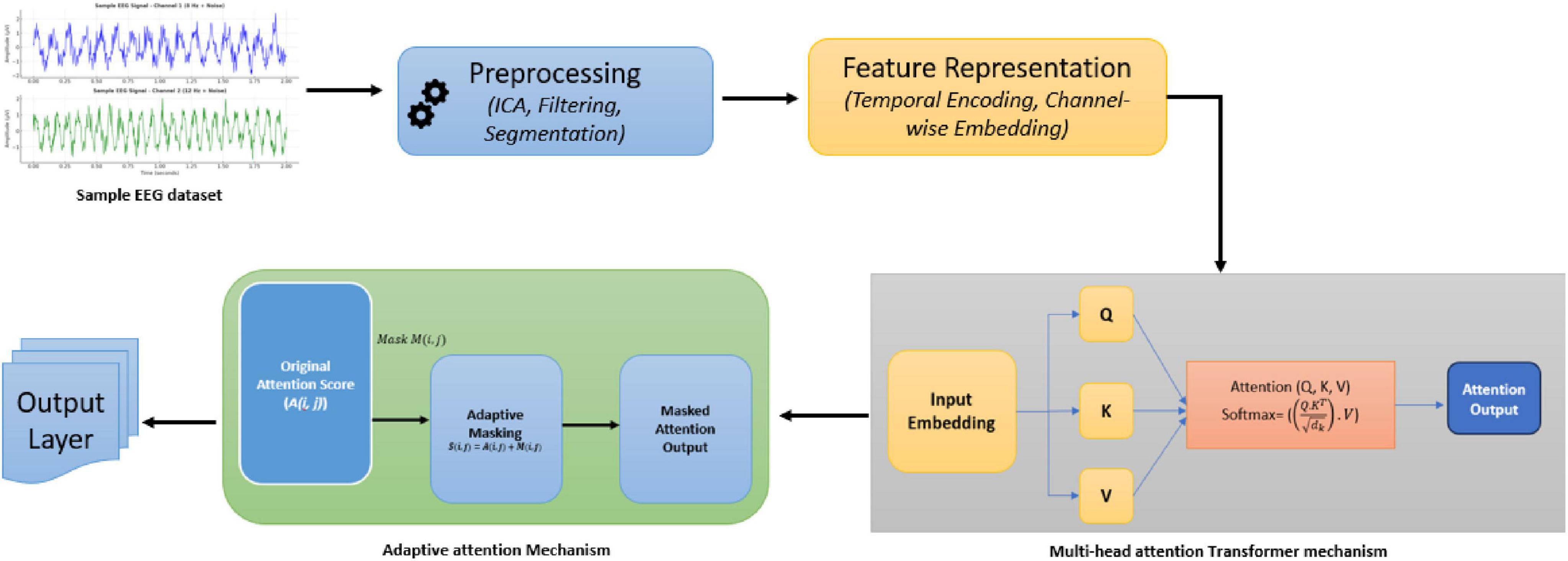 The methodology concludes by integrating preprocessed EEG signals with feature extraction and adaptive transformer-based modeling, as depicted in Figure 3. This framework ensures precise temporal-spatial analysis and robust neurotherapeutic decision support.