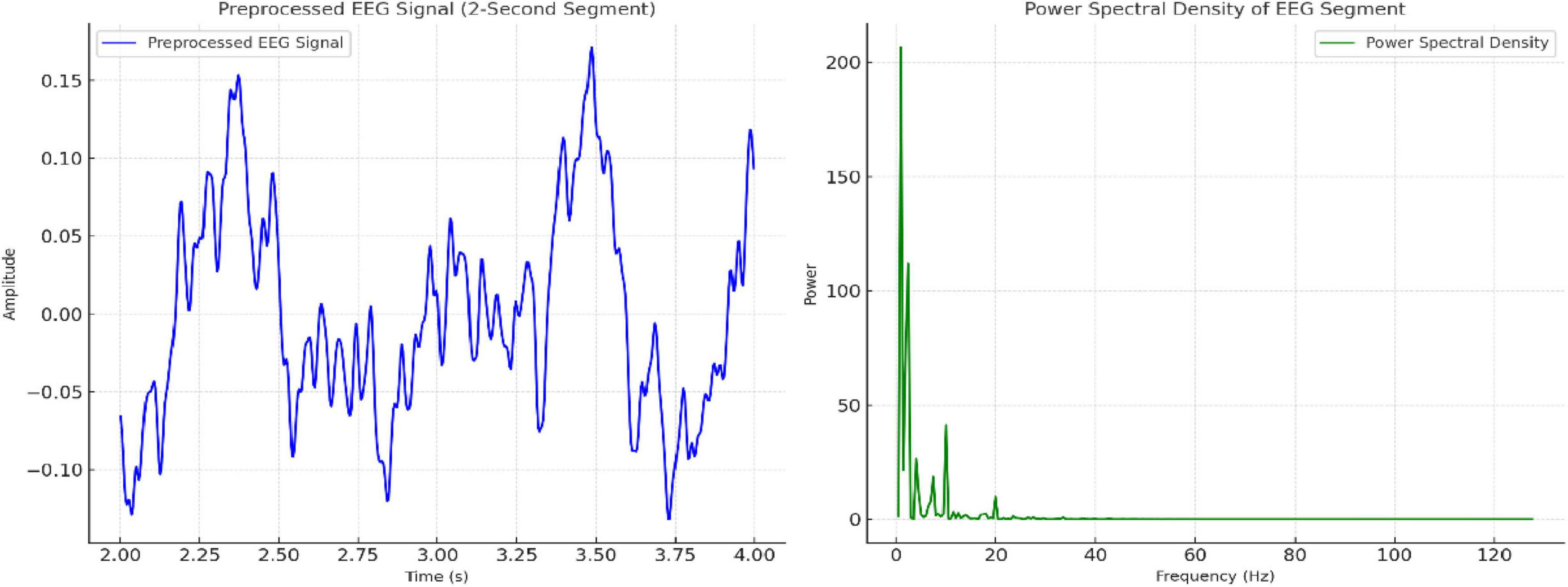 Figure 3. Visualization of preprocessed EEG signal (2-second segment) and its power spectral density (PSD) distribution across frequencies.