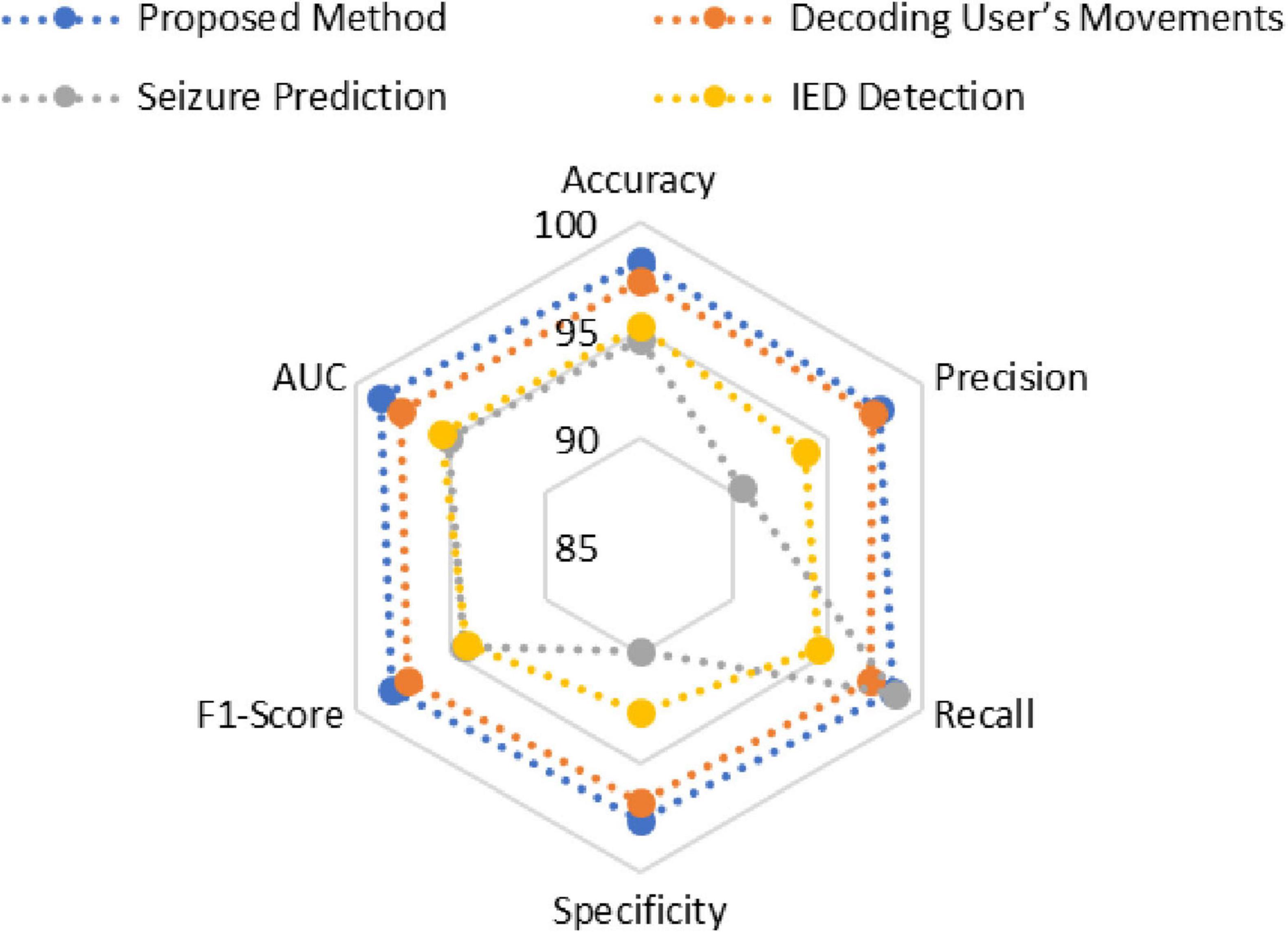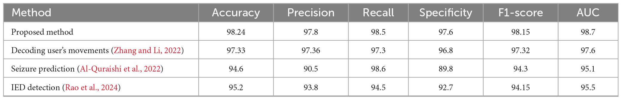 The proposed approach has the highest area under the curve (AUC) value of 98.7%, supporting these findings. This metric highlights the method’s ability to distinguish classes across thresholds. Conclusions show that the proposed method can provide accurate, sensitive, and reliable neurotherapeutic decision support, overcoming limitations in existing methods.