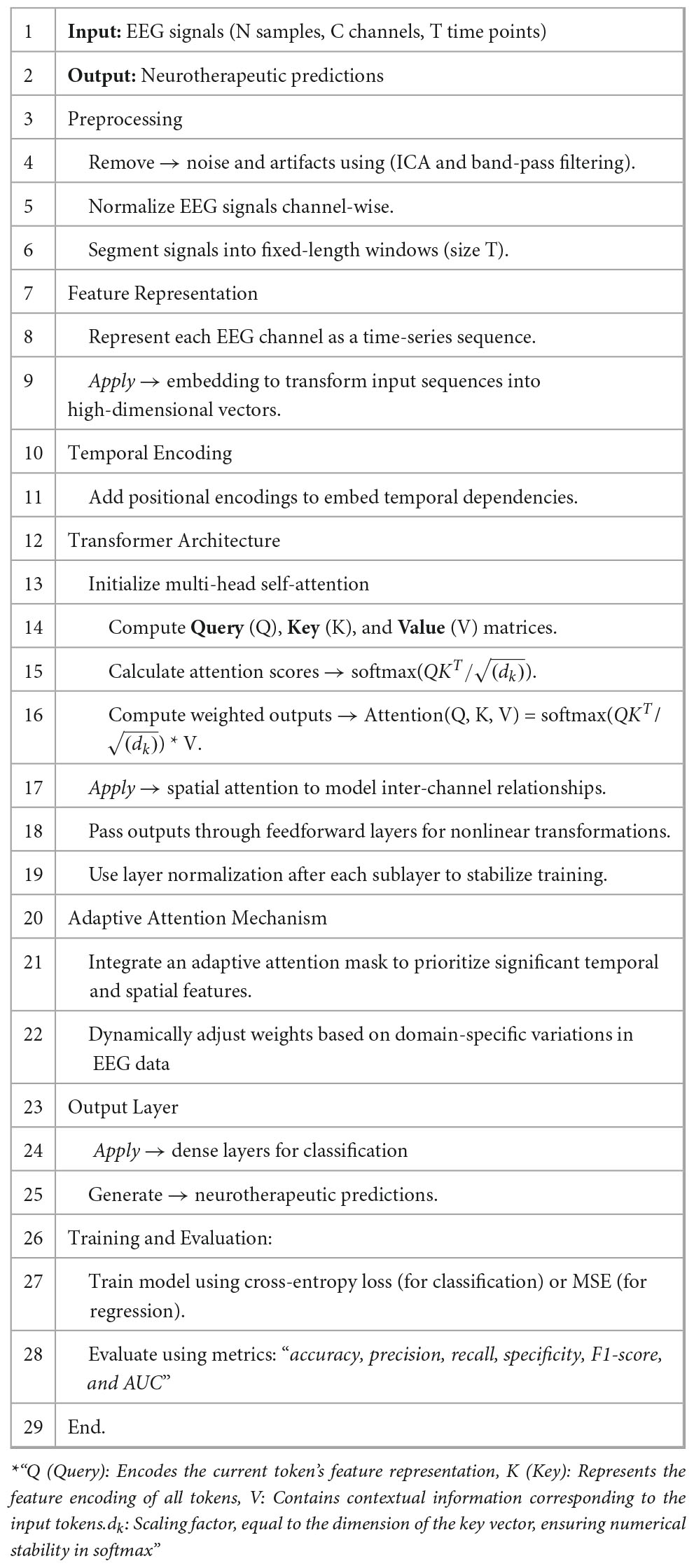 The proposed Algorithm 1 for Adaptive Transformer-Based EEG Analysis leverages advanced transformer architectures to address the challenges of non-stationarity, noise, and temporal-spatial complexity inherent in EEG signals. By integrating domain-specific adaptive attention mechanisms, the algorithm dynamically prioritizes critical regions of the EEG data, enabling precise and interpretable neurotherapeutic predictions. This innovative approach ensures robust performance across diverse subjects and conditions.