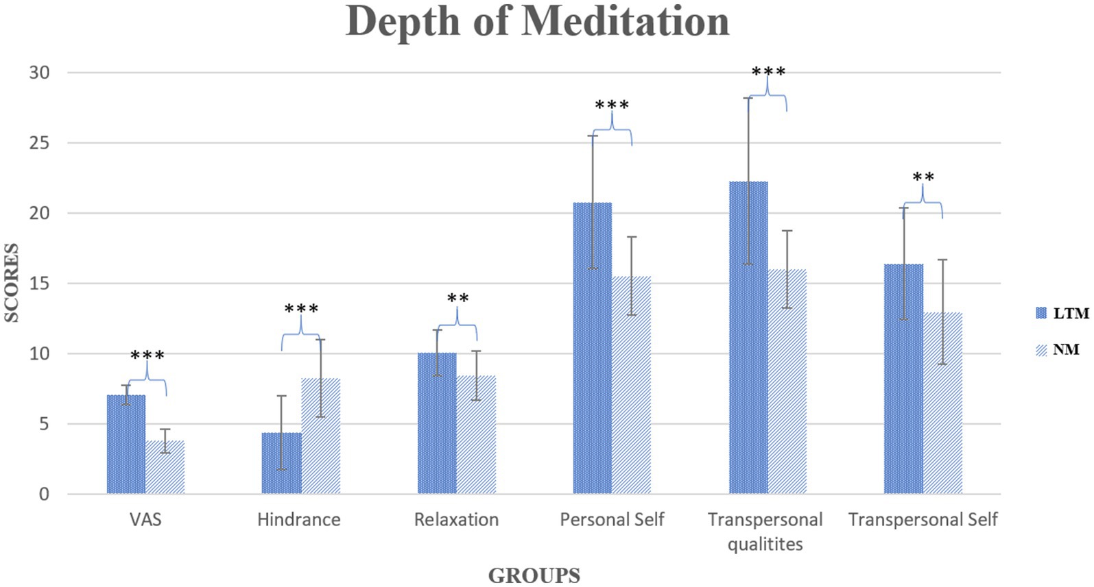 Figure 1. Graphical representation of the depth of meditation among LTM and NM. The bar graph shows the differences in groups (LTM and NM). The LTM group reported significant differences in all subjective variables. VAS, Visual Analogue Scale. **p < 0.01, ***p < 0.001, where * represents the between-group factor.