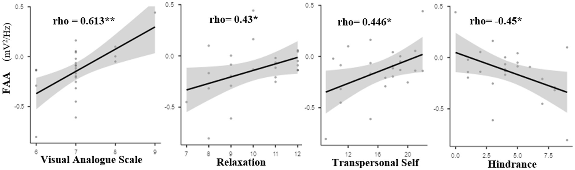 Figure 3. Relationship between frontal alpha asymmetry during transmission and the depth of meditation. Spearman correlation (ρ) between frontal alpha asymmetry (FAA) and self-reported VAS scores for depth of meditation during the transmission state in the long-term meditator (LTM) group. A significant positive correlation was observed. *p < 0.05, **p < 0.01.