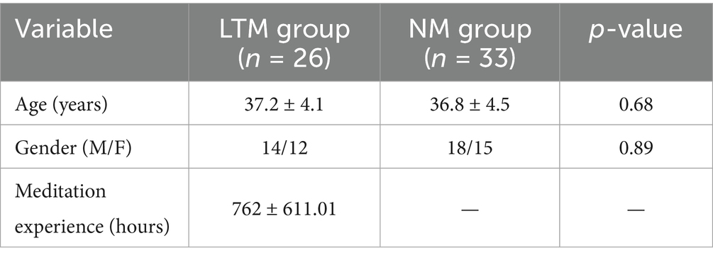 The current cross-sectional study recruited 59 volunteers, aged 30 to 45 years were from South India. Long-term heartfulness meditation practitioners (LTM; n = 26), having over 5 years of experience with an average of 1 h of HM practice daily, and non-meditators (NM; n = 33) with no prior meditation experience participated in the present study. A priori power analysis was conducted using G*Power 3.1 for an independent-samples t-test (dependent means, standard deviation, two-tailed). According to a previous study, effect size (Cohen’s d = 0.7), a significance level of α = 0.05 (two-tailed), and power = 0.80, a total sample size of 56 participants (28 per group) was required (Alyan et al., 2021). EEG data were collected during the HM session and self-reported scales were obtained after the HM session. All participants reported no visual, auditory, or neuropsychiatric issues. Individuals with a history of drug or alcohol abuse were excluded. Healthy participants who showed their willingness to participate were included in the present study. None of the participants was engaged in any other ongoing research activity.