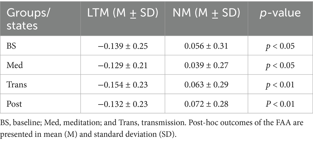 The present study was conducted to assess the between-group comparisons between LTM and NM. The self-reported MEDEQ and VAS scores violated the assumption of normality. Therefore, the Mann–Whitney U-test was performed and showed significant differences among LTM versus NM groups in VAS (U = 2.00, p < 0.01), hindrance (U = 111, p < 0.001), relaxation (U = 182, p < 0.01), personal self (U = 127, p < 0.001), transpersonal qualities (U = 119, p < 0.001), and transpersonal self (U = 192, p < 0.01) shown in Figure 1. The repeated-measure ANOVA (RM-ANOVA) was performed to determine the effect of heartfulness meditation on LTM and NM. The results of the RM-ANOVA showed a significant main effect of group (F(1,52) = 10.473, p < 0.01, η2p = 0.168], but no significant main effect of state [F(2.22,115.53) = 0.098, p > 0.05, η2p = 0.002] and group × state interaction [F(2.22,115.53) = 0.187, p > 0.05, η2p = 0.004]. Post-hoc outcomes of the FAA are shown in Table 2. Moreover, a topographical comparison between LTM and NM of each state (baseline, meditation, transmission, and post) has been shown in Figure 2.