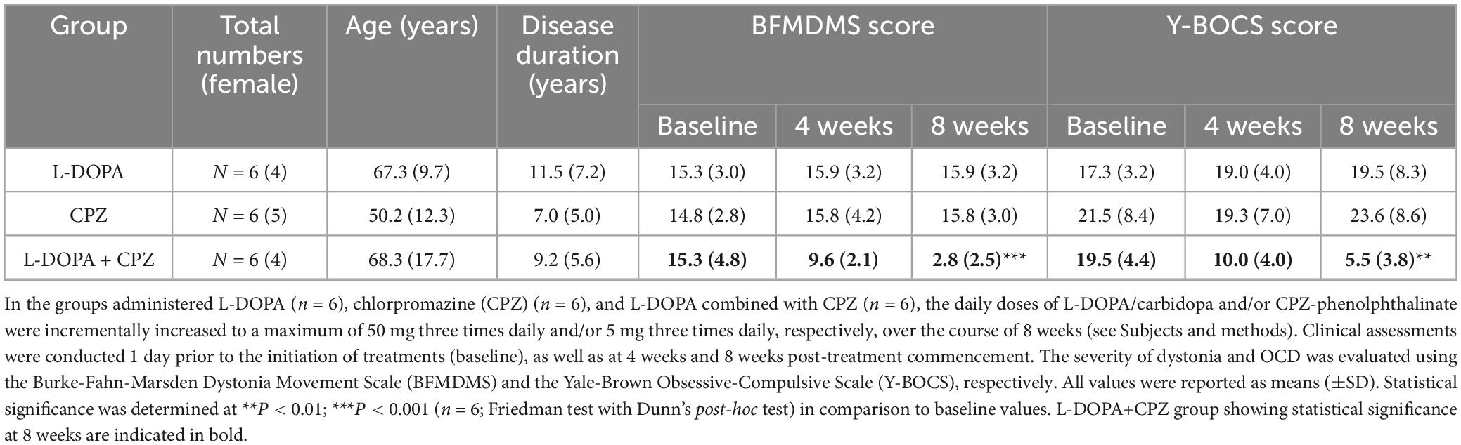 The therapeutic effects of L-DOPA + CPZ, L-DOPA alone, or CPZ alone were assessed over 8 weeks in 18 patients with idiopathic dystonia and OCD, with a mean age of 61.9 years (SD 15.4) and a mean disease duration of 9.2 years (SD 6.0) (see Table 1).