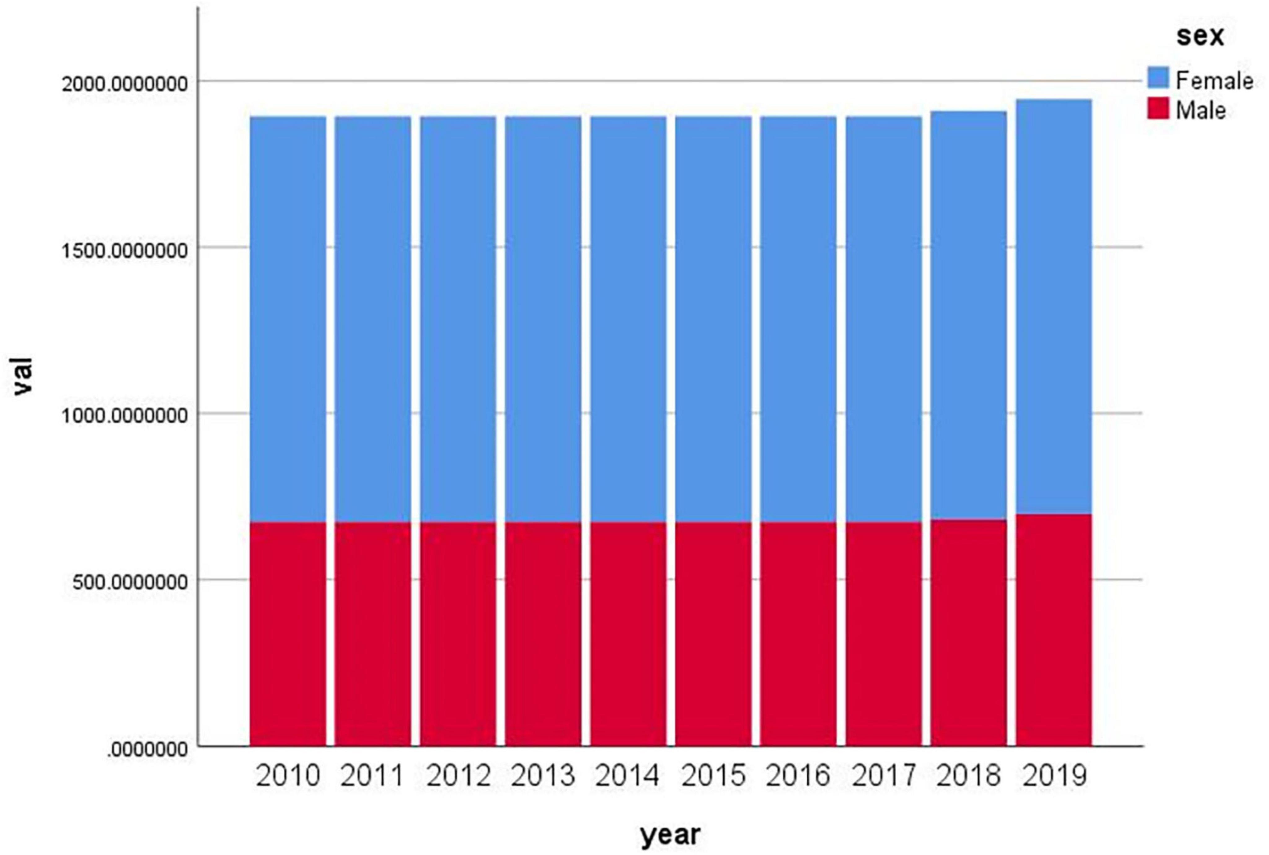 On the basis of data from the GBD2019 database, we plotted a histogram of age-standardized male and female migraine incidence rates in China from 2010 to 2019 (Figure 3). The incidence of migraine in China is increasing in both males and females but is consistently much higher in females than in males. A study performed by Wang et al. (2022), Liu and Tan (2014) analyzed the incidence of sex- and age-differentiated migraine in China from 1990 to 2019 using point and age-period cohorts and concluded that the incidence of migraine in China is consistently much higher in females than in males.