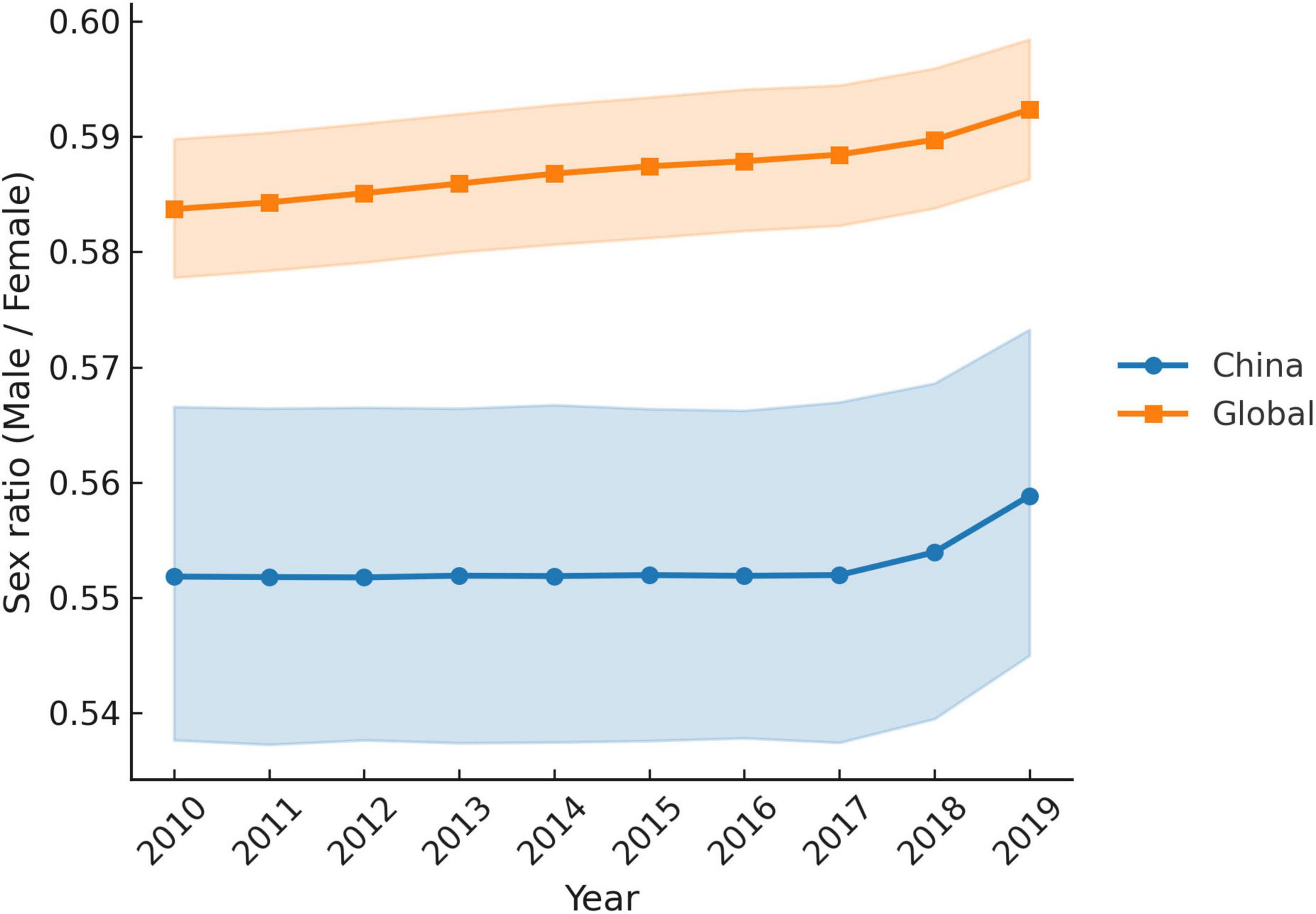 To further elucidate the sex differences in migraine incidence in China, we produced age-standardized male and female incidence rates and incidence sex ratios (male/female) for migraine in China and Global from 2010 to 2019 on the basis of data from the GBD2019 (Figure 4). The bootstrap analysis of age-standardized incidence rates demonstrated a consistent female predominance in migraine for both China and the global population between 2010 and 2019. The sex ratio (male/female) remained stable across years, with median values of approximately 0.55 (95% CI ≈ 0.54–0.56) in China and 0.58 (95% CI ≈ 0.57–0.59) globally. Year-to-year variability was minimal, with narrow confidence intervals indicating stable estimates over time. When the data from 2010 to 2019 were aggregated, the overall male-to-female ratio was 0.55 (95% CI: 0.54–0.56) for China and 0.58 (95% CI: 0.57–0.59) for the global population. The non-overlapping confidence intervals suggest a statistically significant difference, indicating that Chinese women experience a disproportionately greater burden of migraine than men do—a disparity that is more pronounced in China than Global. Genetic factors may contribute to these patterns. For example, Xingkai (2021) reported that variants in the ESR1 gene are associated with the development of migraine in Chinese patients. ESR1 rs2234693 is a risk factor for migraine without aura, female migraine, and menstrual-associated migraine. Nevertheless, the underlying causes of the increased susceptibility to migraine among Chinese women warrant further investigation.