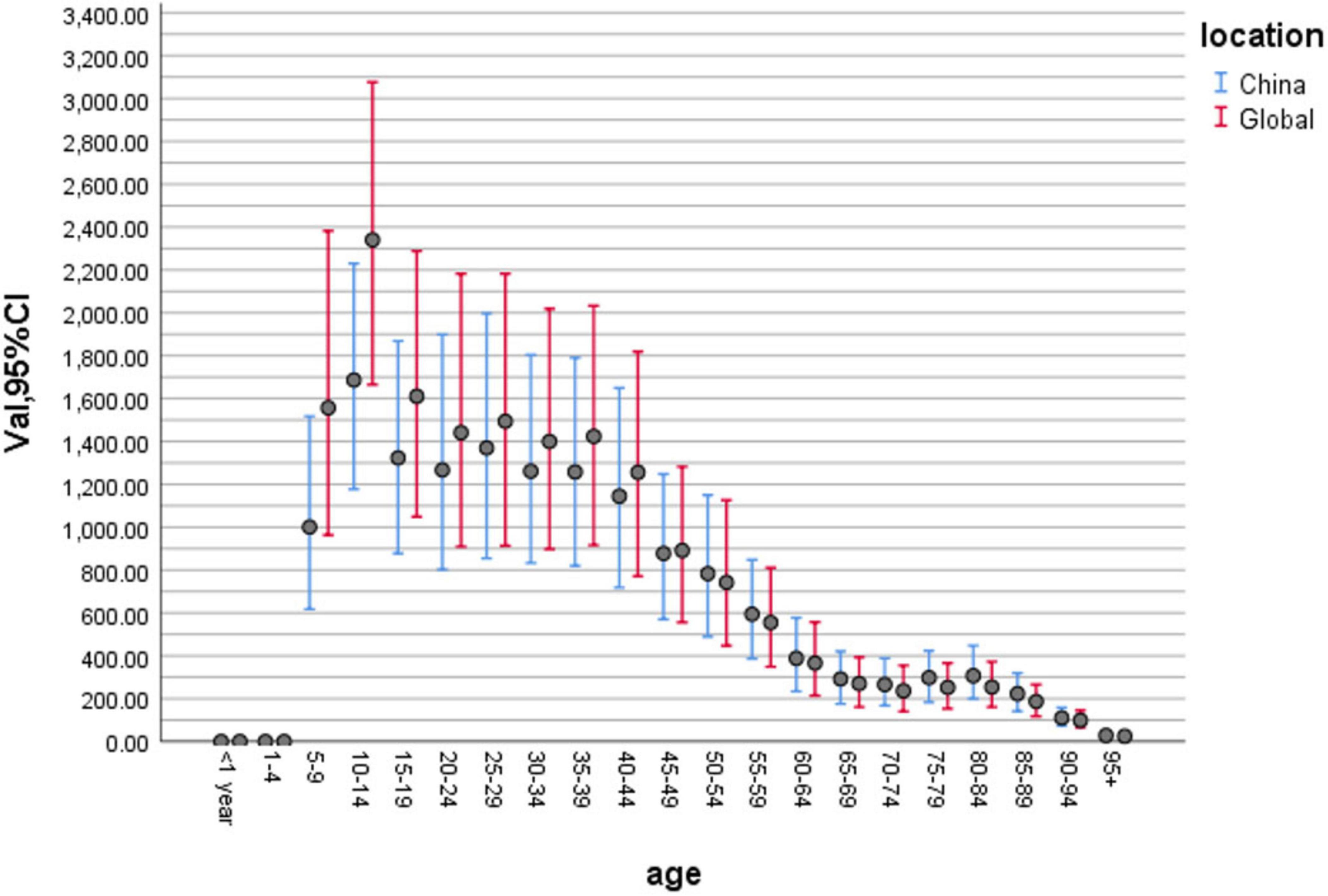 To compare the differences in migraine incidence across different age groups, we constructed a bar chart of the age distribution of migraine incidence in China and globally in 2019 on the basis of relevant data from the GBD2019 (Figure 5). We can see that 10–14 years of age is the period with the highest incidence of migraine in China, followed by 25–29 years of age. The incidence of migraine in China remains high in the age range of 10–44 years. Wang et al. (2022) reported that the incidence of migraine in China was highest in those aged 10–14 years, followed by those aged 22–44 years in both sexes. An epidemiological study in Shanghai (Jin et al., 2013) revealed that the incidence of migraine in children and adolescents varied with age between 13% and 43%, with the highest incidence of migraine occurring in 14–15 year-olds. The age range of 10–19 years is adolescence, and the enormous psychological transition and greater academic pressure may explain the high incidence of migraine at this age. Additionally, when we compared the age distributions of migraine incidence in China and globally in 2019, we were surprised to find that incidence rates in China were always lower than those globally at the age of 5–49 but always higher than those globally at the age of 50 years and older.