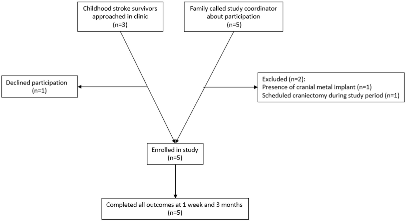 Participants were recruited through the UTHealth Pediatric Stroke Clinic and through participation flyers distributed to local advocacy and support organizations. Inclusion criteria were: (1) Clinical diagnosis of childhood-onset arterial ischemic or hemorrhagic stroke (2) Age 5–19 years (3) At least 3 months from stroke diagnosis (4) chronic hemiparesis due to the childhood-onset stroke, with a Fugl-Meyer Assessment of the Upper Extremity Assessment score ≤58. Exclusion criteria included (1) seizure within the past 6 months (2) cranial metal implants contraindicated to tDCS, such as programmable ventriculoperitoneal shunt, (3) inability to participate in 2-h rehabilitation therapy sessions due to medical fragility (4) craniectomy without bone flap reimplantation, or if the bone flap has been reimplanted <6 months prior to participation. Each study participant and/or their legal guardian, as applicable, completed a medical screening form prior to participation. As this was an open-label pilot study, no power calculation was done prior to participation. A feasibility sample of 5 participants was recruited. A recruitment flowchart is shown in Figure 1. One potential participant declined participation after discussing consent for the study due to concern regarding the potential of side effects associated with the experimental device.