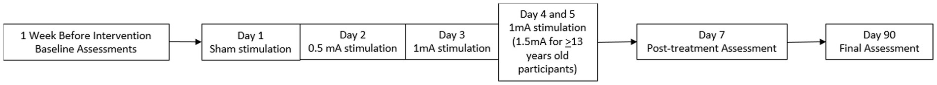 tDCS sessions occurred in the University of Texas Professional Building in the Center for Treatment of Pediatric Neurodegenerative Diseases clinical research suite between 10 AM-4 PM based on participant and therapist availability. All study participants received 5 sessions of tDCS lasting for 20 min each (100 min total). Five sessions occurred once daily for a five-day period. The stimulator used was the Soterix 1×1 tDCS device.