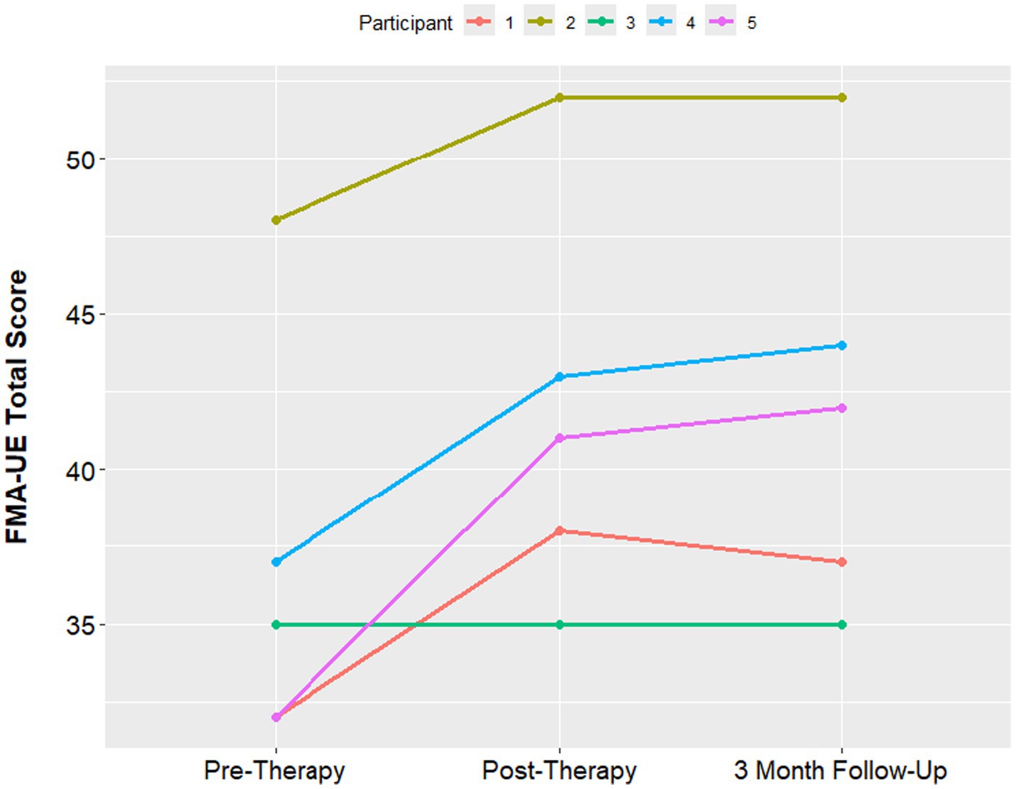 The median Fugl-Meyer UE score was 35 at the pre-therapy assessment, with a minimum of 32 and maximum of 48. At the 1-week post therapy assessment visit, the median FMA-UE score improved to 41, with a minimum of 35 and maximum of 42. The median FMA-UE improved to 42 at the 3 month follow up, with a minimum of 37 and maximum of 44. An improvement of 5 points in the FMA-UE is often considered to be the minimum clinically significant difference (Hiragami et al., 2019). 4 out of 5 participants had a clinically significant increase in the Fugl Meyer score. The one participant who had no improvement in the Fugl-Meyer also had the longest time since stroke at 15 years (Figure 4). PSOM scores remained stable from baseline to 3-month follow up in all participants.