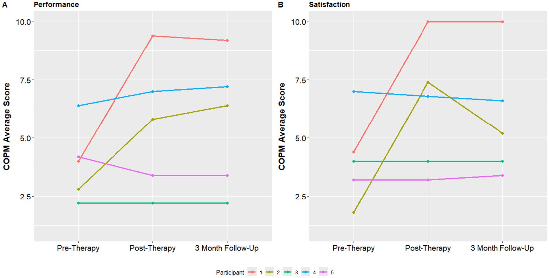 Figure 5. COPM performance and satisfaction at baseline, post-therapy visit and 3-month follow up visit.