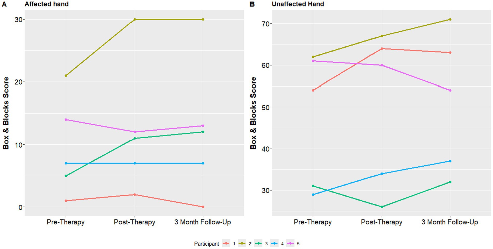 Finally, individual mean Box and Blocks scores at all 3 study assessments with both the affected and unaffected hand are shown in Figure 6. The median box and blocks score of the affected hand at the initial visit was 7, which improved to 11 at the one-week follow up visit and 12 at the 3 month follow up visit.