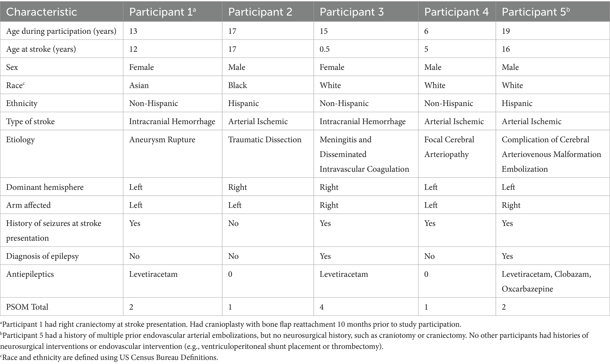 Baseline participant demographics are presented in Table 1. The median age of participation was 15 years. Participants represented a heterogeneous cohort, including three with arterial ischemic stroke and two with intracranial hemorrhage. Stroke etiologies included traumatic dissection, cerebral arteriovenous malformation rupture, meningitis related coagulopathy, and aneurysm rupture. Sex, race and ethnicity were diverse in this cohort. The median time from stroke onset to beginning the study was 1 year. The median PSOM score was 1, and the PSOM did not change for any of the participants during the study period. All participants were able to complete the study. There were no episodes of tachycardia, bradycardia, hypertension or hypotension pre or post therapy. Secondary outcome measures including the Fugl-Meyer Assessment of the Upper Extremity (FMA-UE), Canadian Occupational Performance Measure (COPM), and Box and Blocks assessment are shown in Table 2.