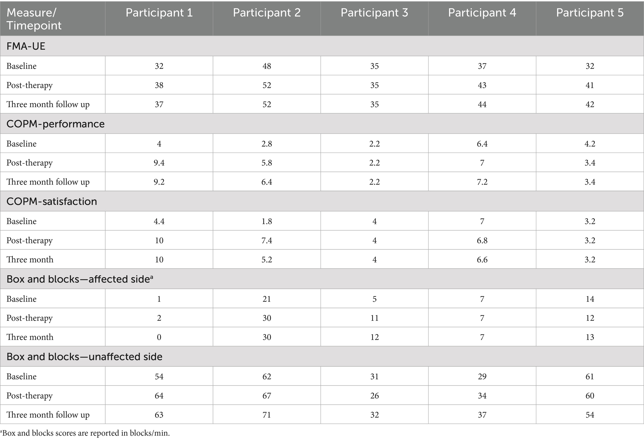 Measures of arm function, satisfaction, and overall level of neurologic impairment during the pre-, post-, and 3-month follow up assessments were obtained. Arm function was measured using the Fugl-Meyer Assessment of the Upper Extremity by the treating therapist during the assessment visits. The Fugl-Meyer Assessment of the Upper-Extremity (FMA-UE) is a functional assessment of the arm that is scored from 0 (complete hemiplegia) to 66 (normal arm function) and can typically be obtained in 30 min. It is one of the most commonly used outcome measures in adult stroke literature, and children as young as 5 have been demonstrated to reliably perform the test (Fasoli et al., 2009). The Canadian Occupational Performance Measure (COPM), a subjective measure of task-specific performance and satisfaction graded by participants and their parents, was also obtained. The Box and Blocks test, a widely used, simple 2-min test of moving blocks from one side of a barrier to another using one of the upper extremities, was also obtained. The FMA-UE, COPM, and Box and Blocks test were done by the treating therapist. One of the study physicians obtained a pediatric stroke outcome measure (PSOM) at each of the assessment visits. The Pediatric Stroke Outcome Measure is a physician-administered rating scale of global function scored from 0 (no deficit) to 10 (profound deficit, immobile and non-responsive). The pediatric stroke outcome measure has been validated for classifying global neurological deficit in pediatric stroke (Slim et al., 2020).