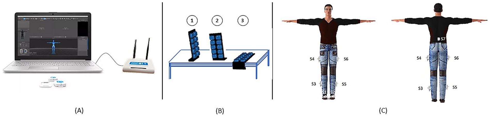 Figure 1. Experimental setup and instrumental assessment steps. (A) IMUs MOVIT network (Captiks s.r.l.); (B) first calibration phase on three positions; (C) second calibration phase—“T” pose.
