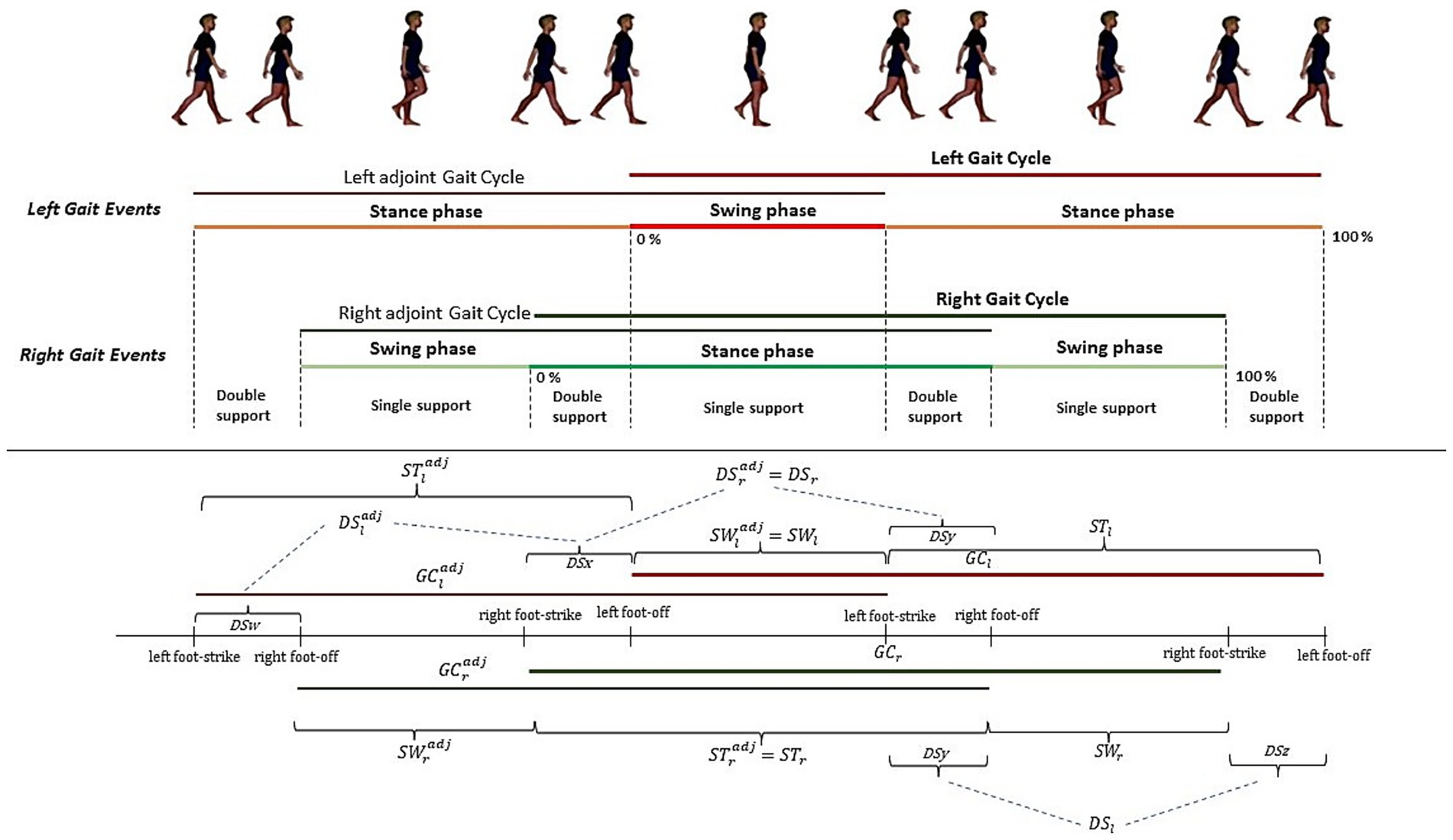 To understand this metric, it is important to define the concept of gait cycle and gait sub-phases. A single gait cycle is defined as the interval between two consecutive heel strike of one foot (for the sake of simplicity, we consider the right foot as reference, however the following discussion can be easily adjusted for the left foot). We can divide the gait cycle according to heel strike and toe off time instants as follows: the time between a heel strike and toe off is called Stance Phase (ST), while the time between the toe off and the next heel strike is named Swing Phase (SW). Moreover, if we consider both feet, we can define the Double Support phase (DS) as the time occurring between the heel strike of one foot and the toe off of the other foot. A graphical explanation is reported in Figure 2.