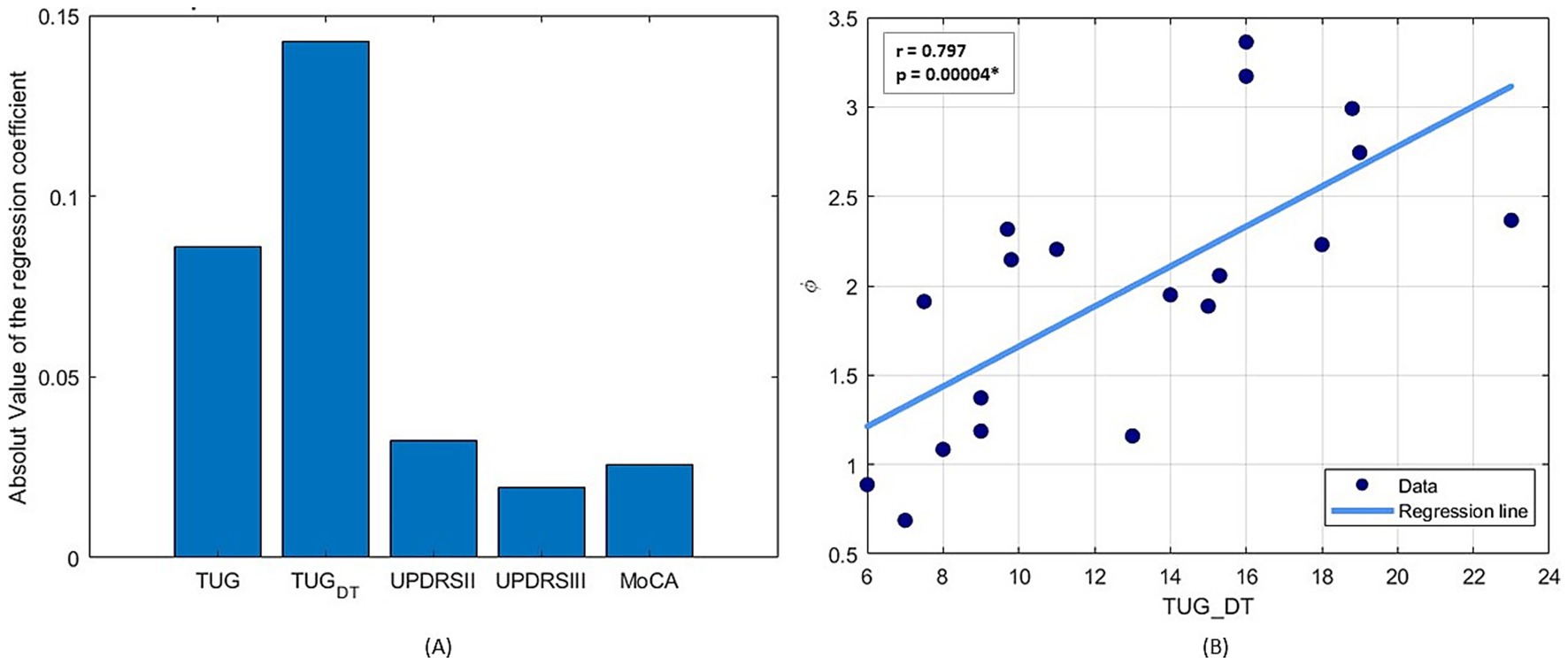 Figure 3. (A) Absolute value of the coefficients of the multiple linear regression to estimate the simultaneous relationship of clinical variables on φ-bonacci gait number. (B) Spearman linear correlation results between TUG Dual Task and φ-bonacci gait number.