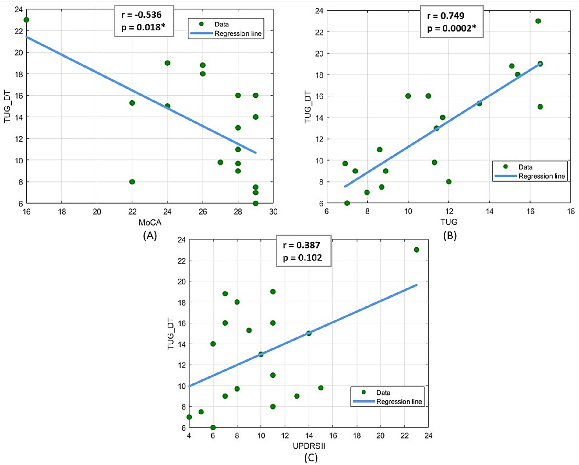 Figure 4. (A) Spearman linear correlation results between MoCA and TUG Dual Task, (B) Spearman linear correlation results between TUG and TUG Dual Task, (C) Spearman linear correlation results between UPDRS II and TUG Dual Task.