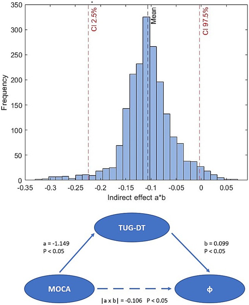 Starting from the fact that there is a significant correlation between TUG-DT and MoCA and wanting to investigate whether cognitive abilities can significantly influence walking motor performance, bootstrapping (He et al., 2024) was used to test the mediation effect (Figure 5), with a duplicate sample size of 2000. The 95% confidence interval of the indirect effect (a*b = −0.106) did not include zero (CI: −0.224; −0.003), therefore, the mediation effect proved to be significant. This technique was used to test the indirect effect of MoCA on φ-bonacci gait number. Mediation analysis showed that the MoCA score, indicative of global cognitive function, significantly and negatively predicted the time taken to complete the TUG-DT (a = −1.149; p < 0.05), suggesting that higher cognitive levels are associated with better motor performance in situations of increased attentional load. In turn, the duration of the TUG-DT was significantly and positively associated with the φ-bonacci gait number, controlling for the MoCA score (b = 0.099; p < 0.05), indicating that longer execution times correlate with lower gait harmonicity. The indirect effect of MoCA on φ-bonacci gait number, mediated by the TUG-DT, was equal to −0.106, and its significance was confirmed by bootstrapping with 2000 samples (95% CI not containing zero). These results may suggest that better cognitive function may contribute to improved gait harmonicity indirectly, by enhancing motor control in dual-task conditions.