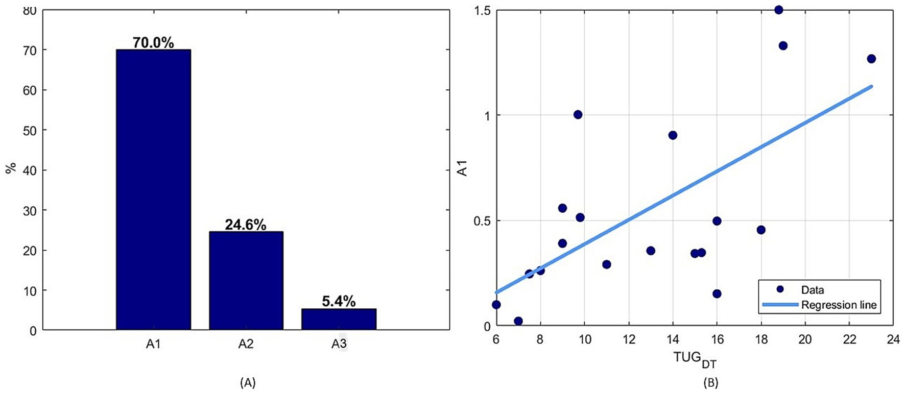 Figure 6. (A) Percentage normalized values of the coefficients of the multiple linear regression to estimate the simultaneous relationship of the set of parameters with respect to the φ-bonacci gait number, (B) Spearman linear correlation results between A1 parameter and TUG Dual Task.