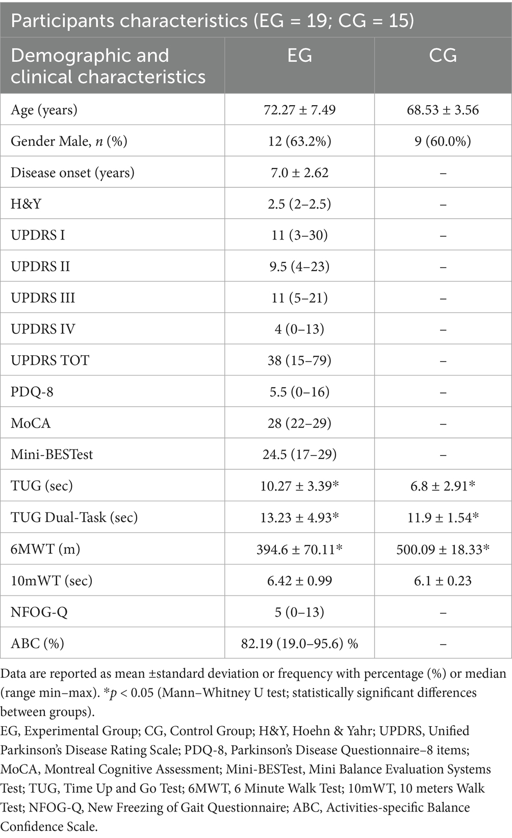 Twenty-two persons with PD were recruited from the day-hospital of the IRCCS San Raffaele (Rome, Italy) as experimental group (EG) and fifteen healthy adults were enrolled as a control group (CG). All eligible participants signed informed consent and met the inclusion criteria set out in the study protocol. Inclusion criteria for the EG included: age between 30 and 80 years; diagnosis of Parkinson’s disease according to the Movement Disorder Society (MDS); Hoehn & Yahr (H&Y) scale score between 2 and 3 in the “on” phase; Montreal Cognitive Assessment (MoCA) screening test score ≥22 (Fiorenzato et al., 2024); Movement Disorder Society Unified Parkinson’s Disease Rating Scale (MDS-UPDRS) Part IV score ≤2 in both items (duration and disability) related to dyskinesias; stabilized treatment; ability to understand and sign the informed consent for the study; ability to comply with the study procedures. Exclusion criteria included: neurological pathologies superimposed on Parkinson’s disease, psychiatric complications, or personality disorders; musculoskeletal disorders that compromise movement; severe language deficits that may lead to the inability to understand and comply with the study procedures; absence of signed informed consent to the study. Inclusion criteria for the CG included age between 35 and 85 years old, absence of pathologies affecting the lower limb function and cognitive and/or severe visual deficit. Although twenty-two subjects were initially recruited for the EG, valid and analyzable data were ultimately obtained for only nineteen participants. Two participants were unable to complete the 6-Minute Walk Test for clinical reasons (fatigue and discomfort), and one participant was excluded due to a technical issue during the temporal signal acquisition.