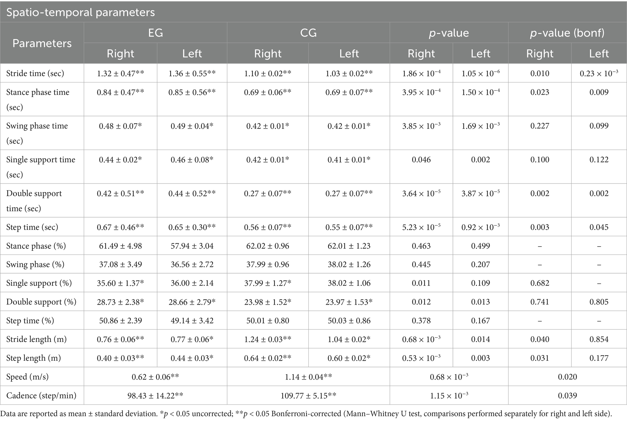 All kinematic data and spatial–temporal parameters acquired during the 6MWT were collected and analyzed; these results were compared with normative data. Our results of the CG reflected the literature, specifically, a systematic review (Herssens et al., 2018) that collected 18 studies aimed at examining differences in spatial–temporal parameters and gait variability across the adult life span in healthy subjects. Data were extracted from 2,112 healthy adults. First, we observed that in pwPD, the average walking speed is characterized by a reduction of about 50% compared to healthy adults of the same age group. This could be dictated by the bradykinesia typical of the disease. Furthermore, the average step frequency expressed in steps/min observed in people with PD is lower than in healthy subjects of the same age group. This difference, greater than 10%, reflects a reduction in locomotor rhythm in affected subjects. Regarding step length, pwPD show significantly lower values than healthy adults. This corresponds to a reduction between 28 and 35%, indicative of a marked hypokinesia. The length of the double step (stride) in pwPD is also significantly shorter than in healthy subjects of the same age. This translates into an average reduction of approximately 37%, resulting in decreased movement efficiency between groups comparison and the results of the systematic review allowed us to demonstrate that pwPD have a significantly reduced walking speed, a lower cadence, a shortened step and stride length, a prolonged step time, and an increased double support, reflecting compensatory strategies to avoid falls. These differences highlight a marked reduction in gait efficiency and stability, characteristics of disease-related motor disorders. Furthermore, comparing these results with those obtained from a second study conducted by Beauchet et al. (2017) on a sample of healthy subjects of the same age, it was confirmed that the most significant parameter that differs most from the normative data is the stride length and then the speed expressed in m/s, and the results just described were also confirmed. However, it should be specified that these conclusions are valid when the person is in the “ON” phase, that is, approximately 1 h after taking the pharmacological therapy of Levodopa, and some parameters and results could be significantly variable if the participants is in the “ON” or “OFF” phase. Comparing the results obtained with those of the study by Chien et al. (2006) where data were acquired from people during both the “ON” and “OFF” phases who were following Levodopa as pharmacological therapy, the following emerged: between the two phases, a parameter that differs significantly emerges, which is the stride length, which could be used as the most effective predictor to determine the state of the pwPD when taking pharmacological therapy and when not taking it, therefore this parameter could be used to provide information on the degree of bradykinesia, unlike cadence which does not seem to vary between the two phases. Compared to the healthy subjects analyzed in the study by Chien et al. (2006), and comparing with the results obtained by us, the stride length and speed emerge as significant parameters of the presence of PD.