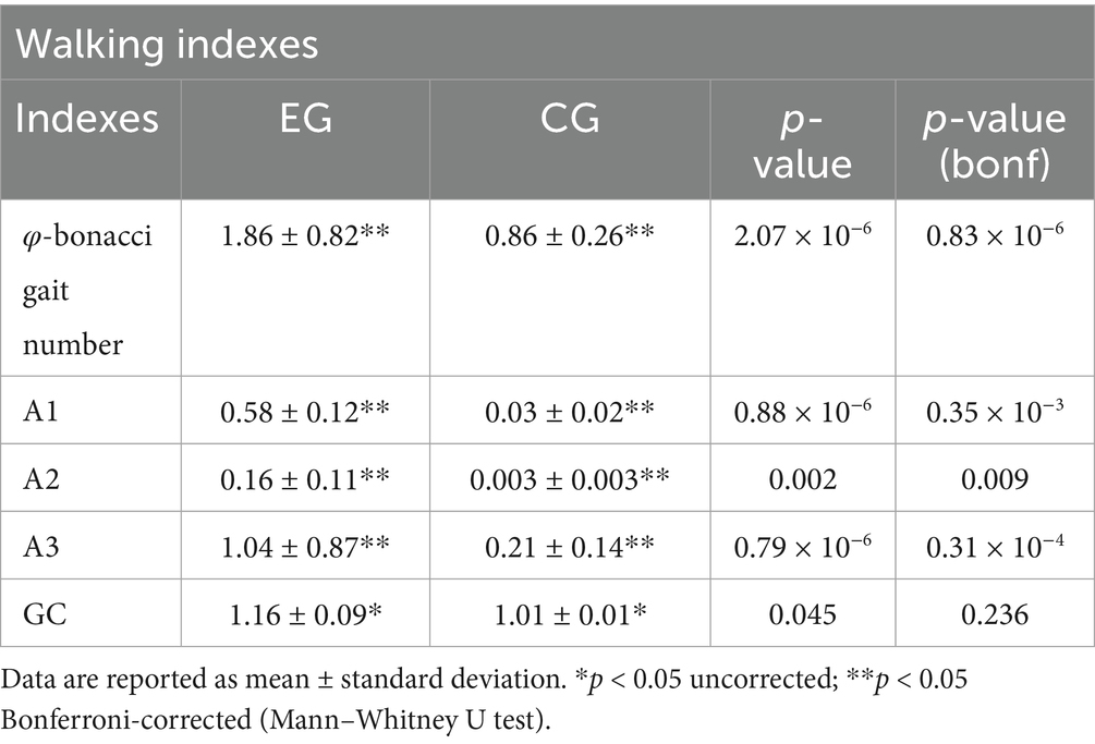 The calculated φ-bonacci gait number (Table 3) shows that its average trend in the neurological population differs significantly from the normative value examined on the healthy adult population. Compared to controls, A1, A2 and A3 were markedly altered in pwPD, whereas in the normative condition these parameters approach zero, reflecting optimal gait harmonicity.