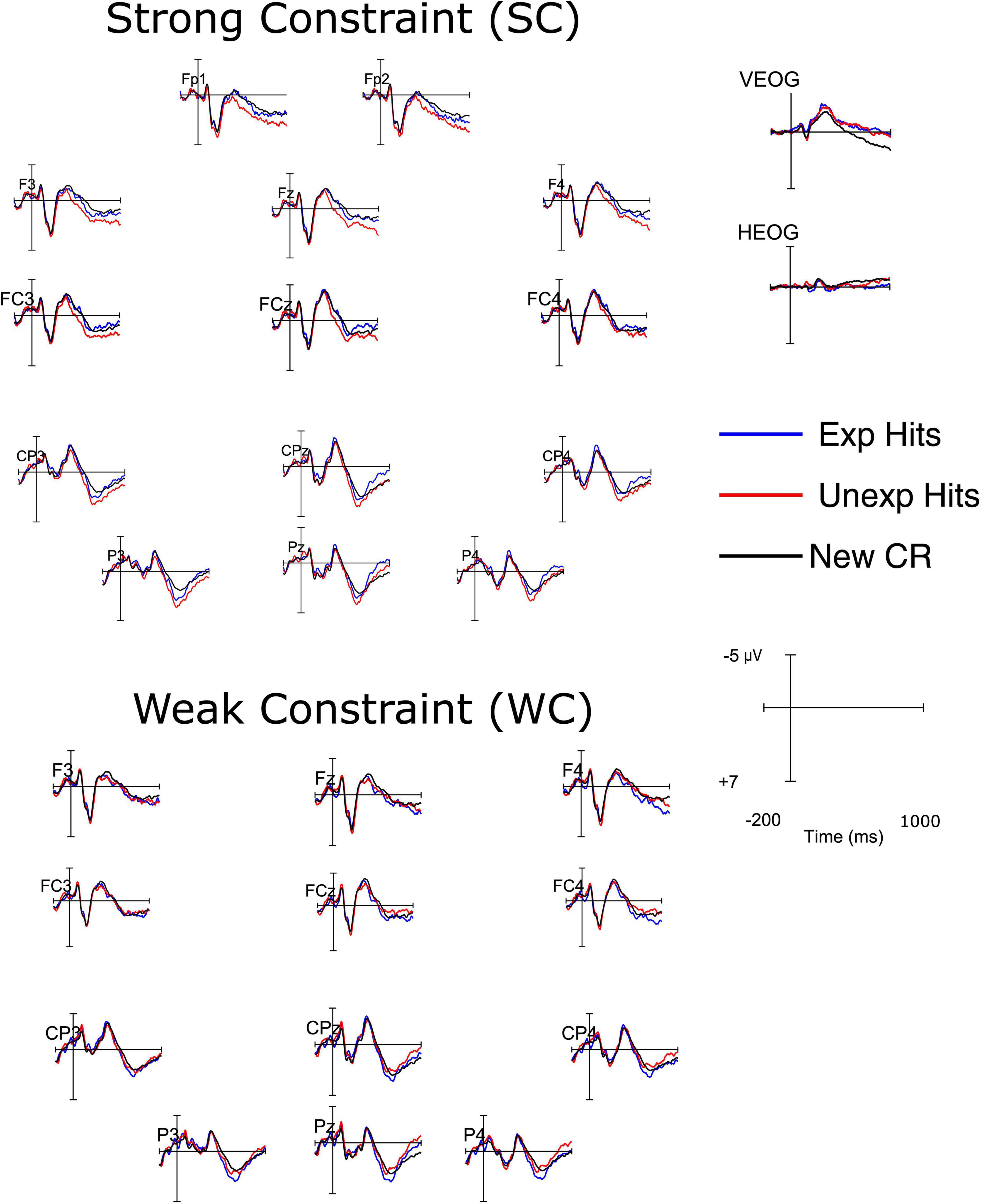 Figure 1. Event-related potentials (ERP) waveforms elicited at electrodes of the anterior (F3, Fz, F4, FC3, FCz, FC4) and posterior (CP3, CPz, CP4, P3, Pz, P4) electrode clusters by the onset of target words in the recognition memory test. In the top half, words encoded in (SC) sentences, prefrontal (Fp1 and Fp2) and (horizontal and vertical) EOG electrodes are included. Bottom half: words encoded in weak constraint (WC) sentences. The alignment of waveforms corresponds to the approximate topographical locations of electrodes over the scalp.