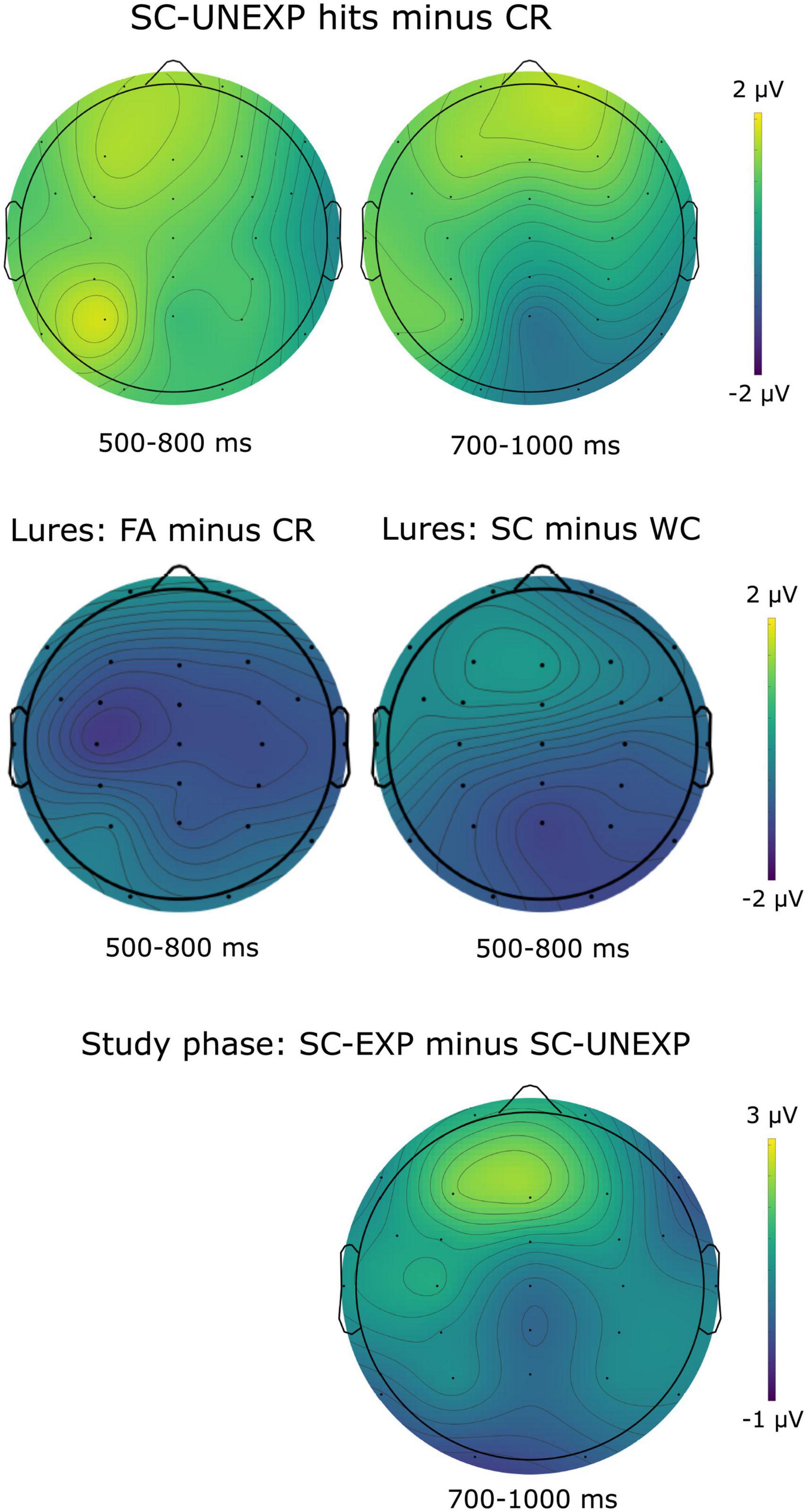 Figure 2. Topographical distributions of observed effects. Top: differences between SC-UNEXP hits and correct rejections during the test phase. Middle: left – differences between false alarms and correct rejections for expected lures in the test phase. Right – differences between expected lures from strong constraint (SC) versus weak constraint (WC) sentences. Bottom: differences between expected and unexpected completions of SC sentences during the study phase.