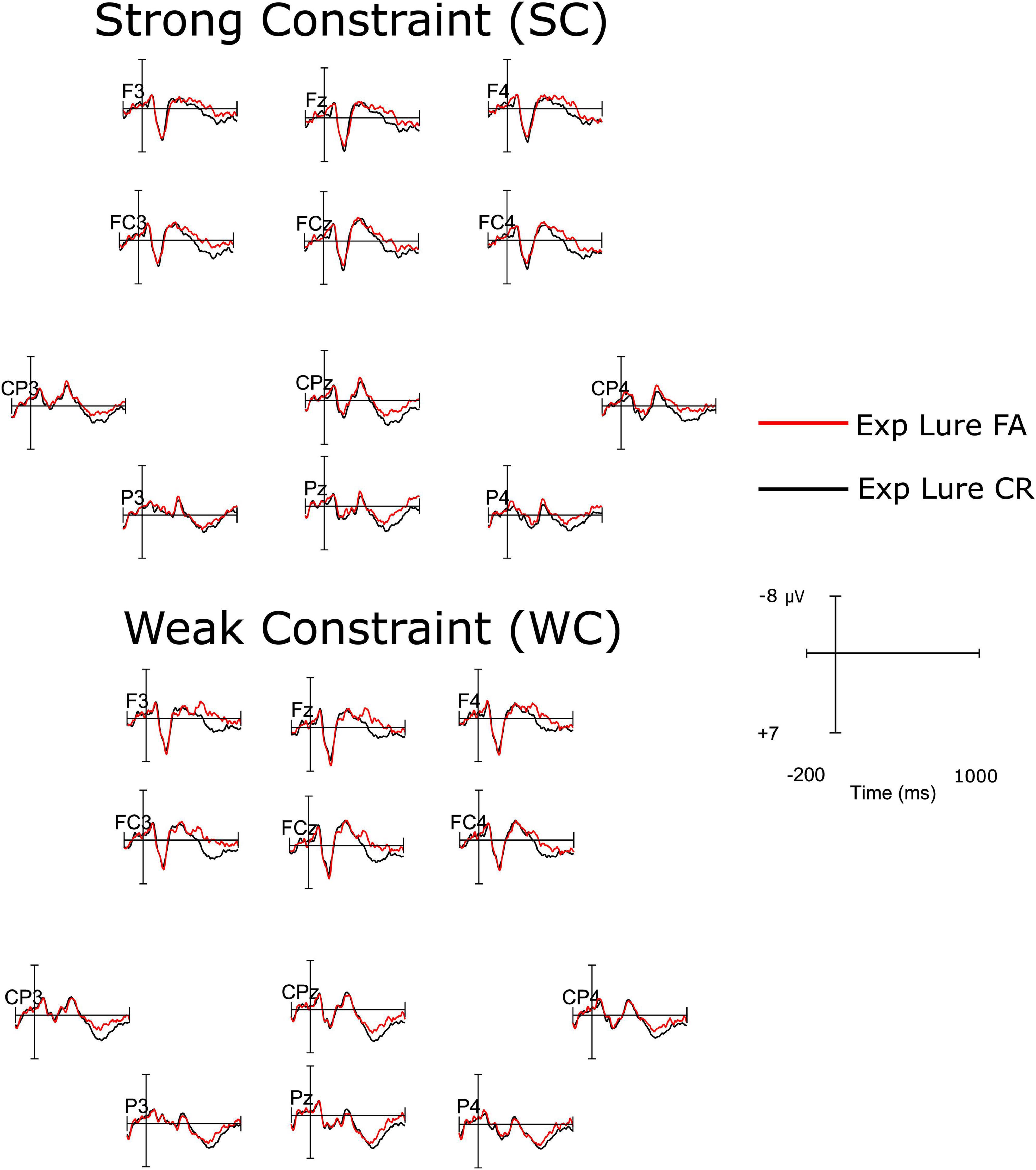 Figure 3. Event-related potentials (ERP) waveforms elicited at electrodes of the anterior (F3, Fz, F4, FC3, FCz, FC4) and posterior (CP3, CPz, CP4, P3, Pz, P4) electrode clusters by the onset of lure words in the recognition memory test. Top half: words encoded in strong constraint (SC) sentences, bottom half: words encoded in weak constraint (WC) sentences. The alignment of waveforms corresponds to the approximate topographical locations of electrodes over the scalp.