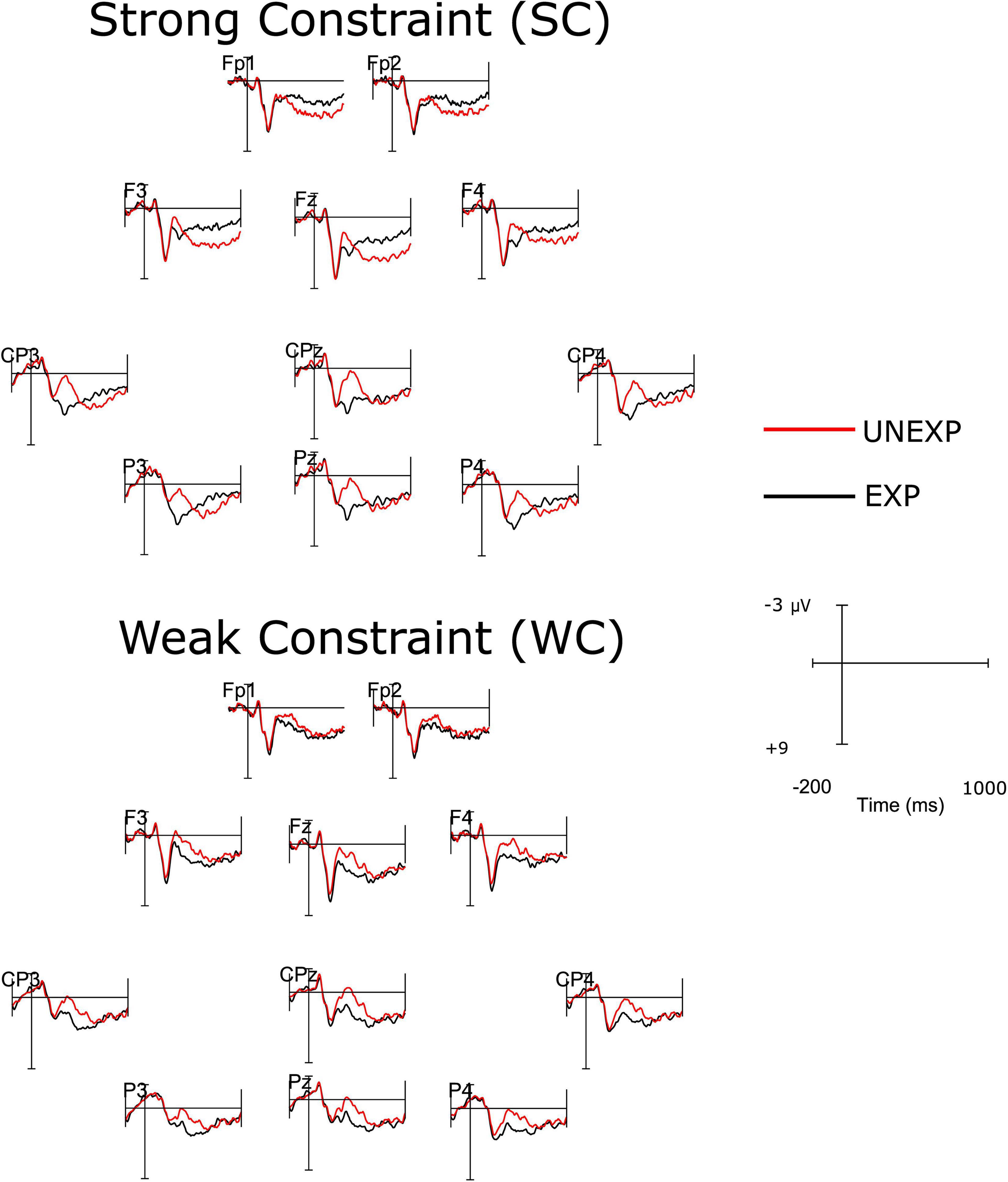 Figure 4. Event-related potentials (ERP) waveforms elicited at electrodes of the anterior (Fp1, Fp2, F3, Fz, F4) and posterior (CP3, CPz, CP4, P3, Pz, P4) electrode clusters by the onset of target words in the study phase. Top half: words encoded in strong constraint (SC) sentences, bottom half: words encoded in weak constraint (WC) sentences. The alignment of waveforms corresponds to the approximate topographical locations of electrodes over the scalp.